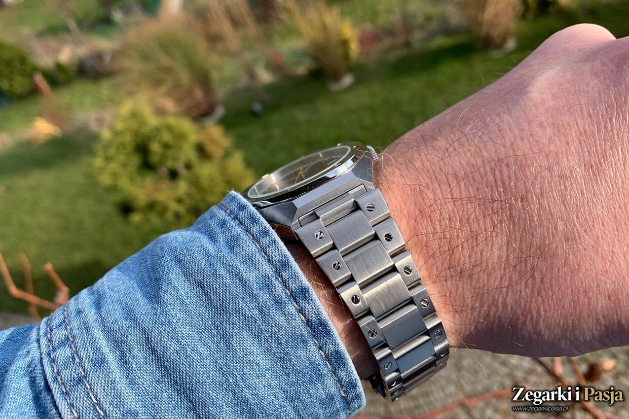Bransoleta zdaje się tworzyć z kopertą spójną całość, w czym pomaga brak wyraźnego wydzielenia uszu stanowiących monoblok z resztą. Mimo to można zastosować klasyczny pasek, tyle, że ten zegarek na dedykowanej bransolecie wygląda najlepiej.