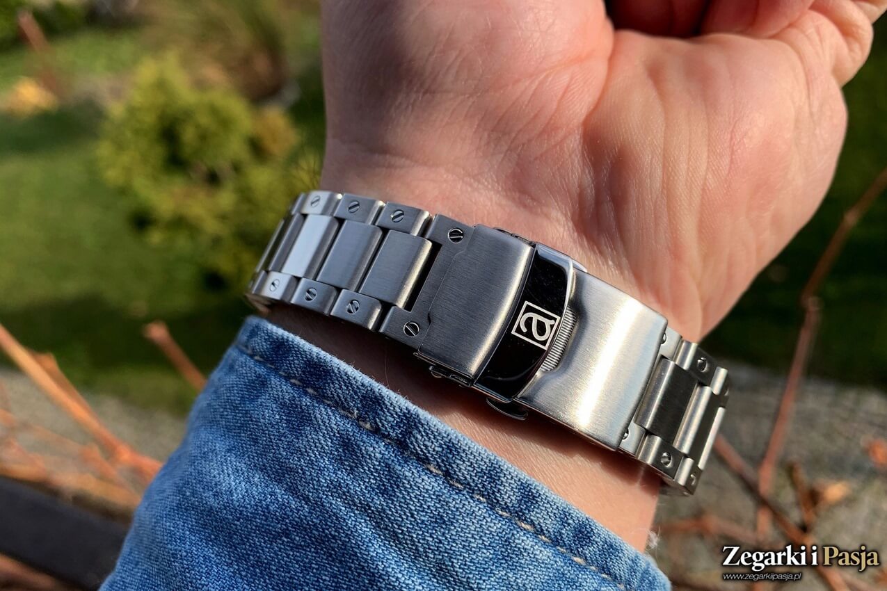 Wracając do frontowej strony zegarka - zastosowano płaskie szafirowe szkło chroniące tarczę, o której napiszę więcej za moment. Aby zakończyć kwestię opisu obudowy zegarka, pozostaje nam jeszcze bransoleta. Nie jest ona zintegrowana z kopertą, jak to często było w czasach powstawania pierwowzoru naszych zegarków. Zadbano jednak o optyczną integrację.