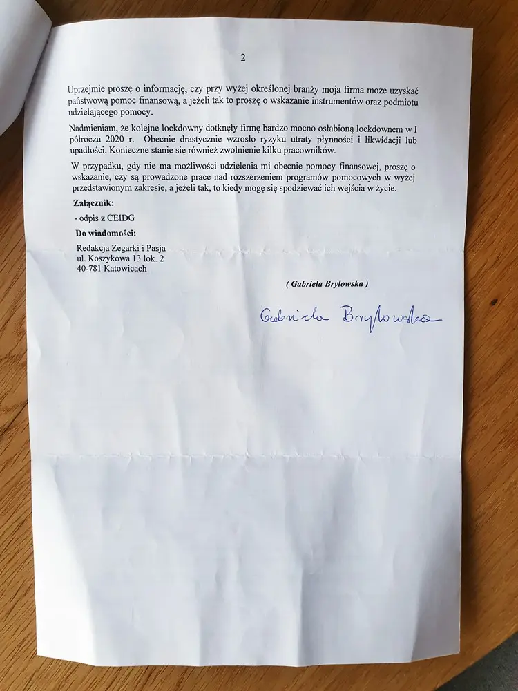 Wobec rażącej dyskryminacji w stosunku do branż pokrewnych, czyli sprzedaży detalicznej odzieży, sprzedaży obuwia i galanterii skórzanej, wnioskujemy o dodanie naszego kodu pkd 47.77.Z do listy kodów objętych wsparciem finansowym dla firm przymusowo zamkniętych w okresie tzw. lockodownów jesienno-zimowych.”