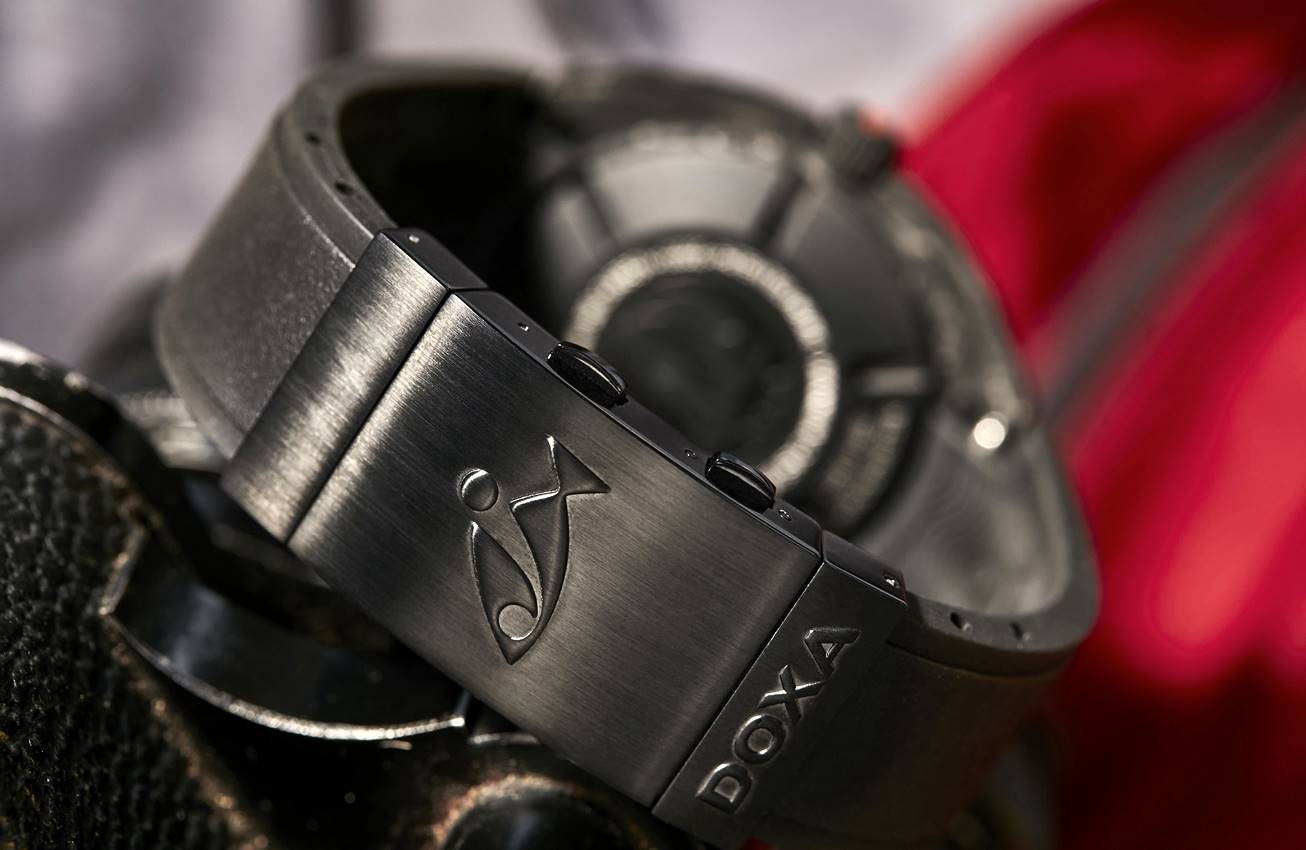 Pasek, podobno bardzo wygodny w użytkowaniu, niezależnie od wersji wyposażony jest w składane zapięcie z czarną powłoką PVD i logo marki wraz z charakterystyczną rybką Doxy. Oczywiście zaimplementowana jest możliwość szybkiego przedłużenia na piankę nurkową.