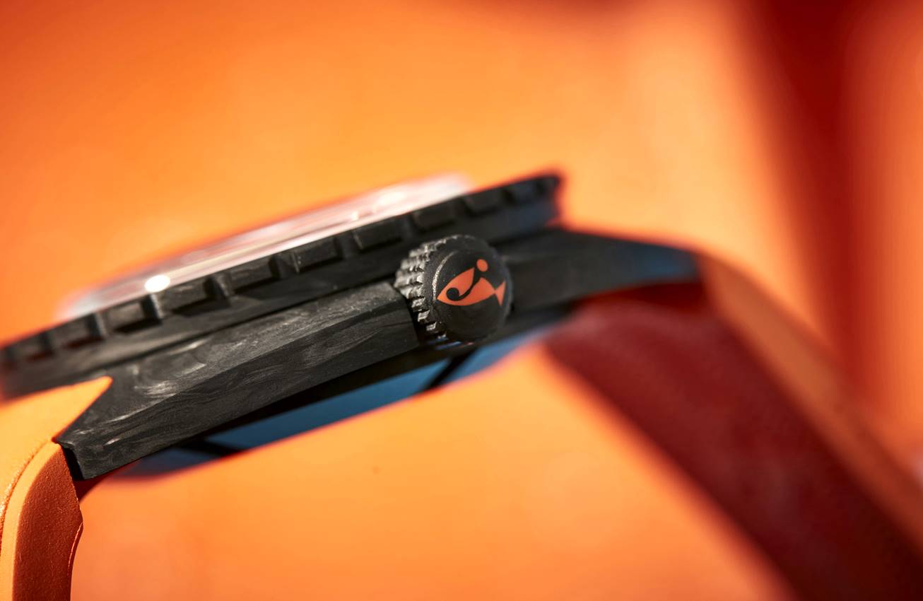Pod warstwą włókna węglowego jest jeszcze wewnętrzna obudowa. Model SUB 300 Carbon COSC ma tę wewnętrzną obudowę wykonaną z tytanu, która odpowiada za odporność na ciśnienie wody. Oczywiście jest też zakręcana koronka, co razem umożliwia osiągnięcie wspomnianej wcześniej klasy wodoszczelności do poziomu 30 ATM, czyli 300 metrów.