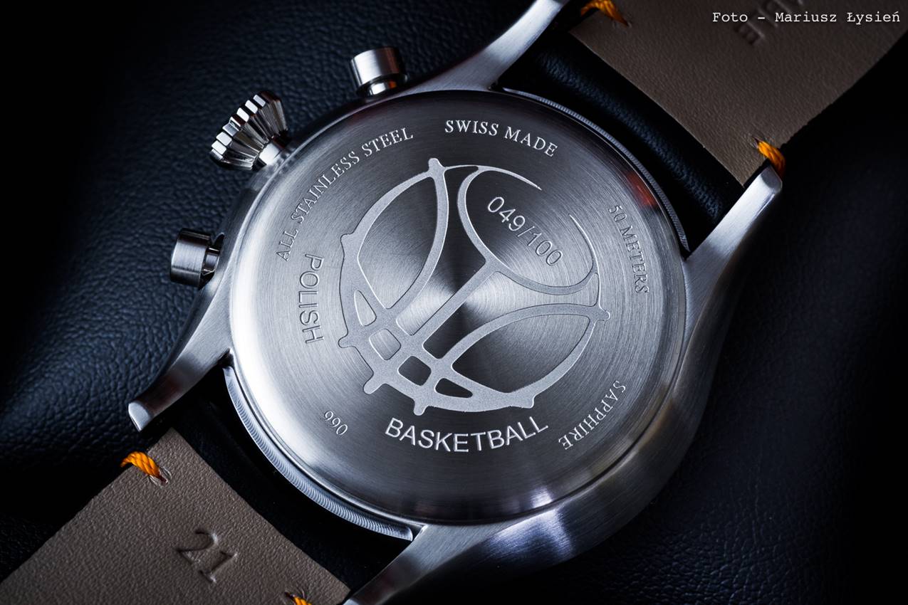 Bliżej krawędzi, w okręgu wygrawerowano podstawowe informacje o tym modelu zegarka, a centralną część dekla zdobi logo Polskiego Związku Koszykówki, a także indywidualny numer danego egzemplarza zegarka w limitowanej do 100 serii.