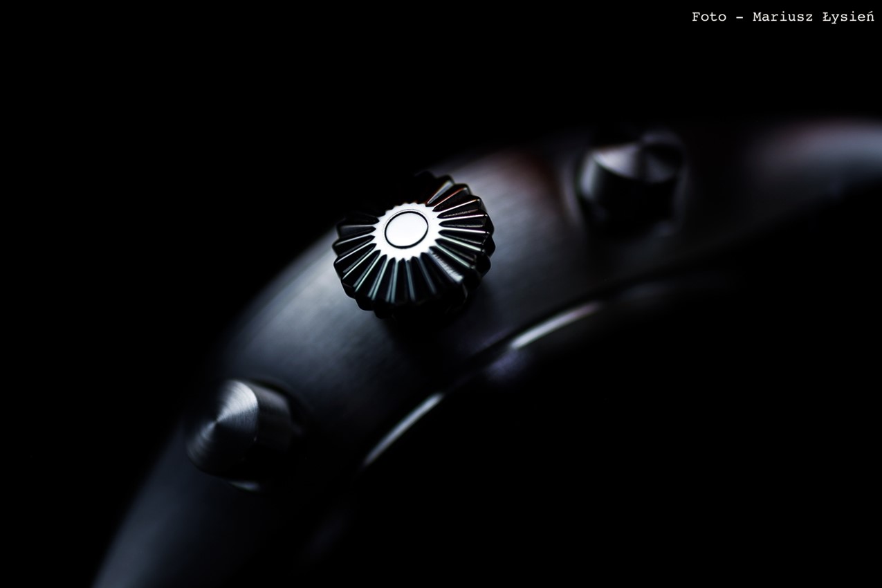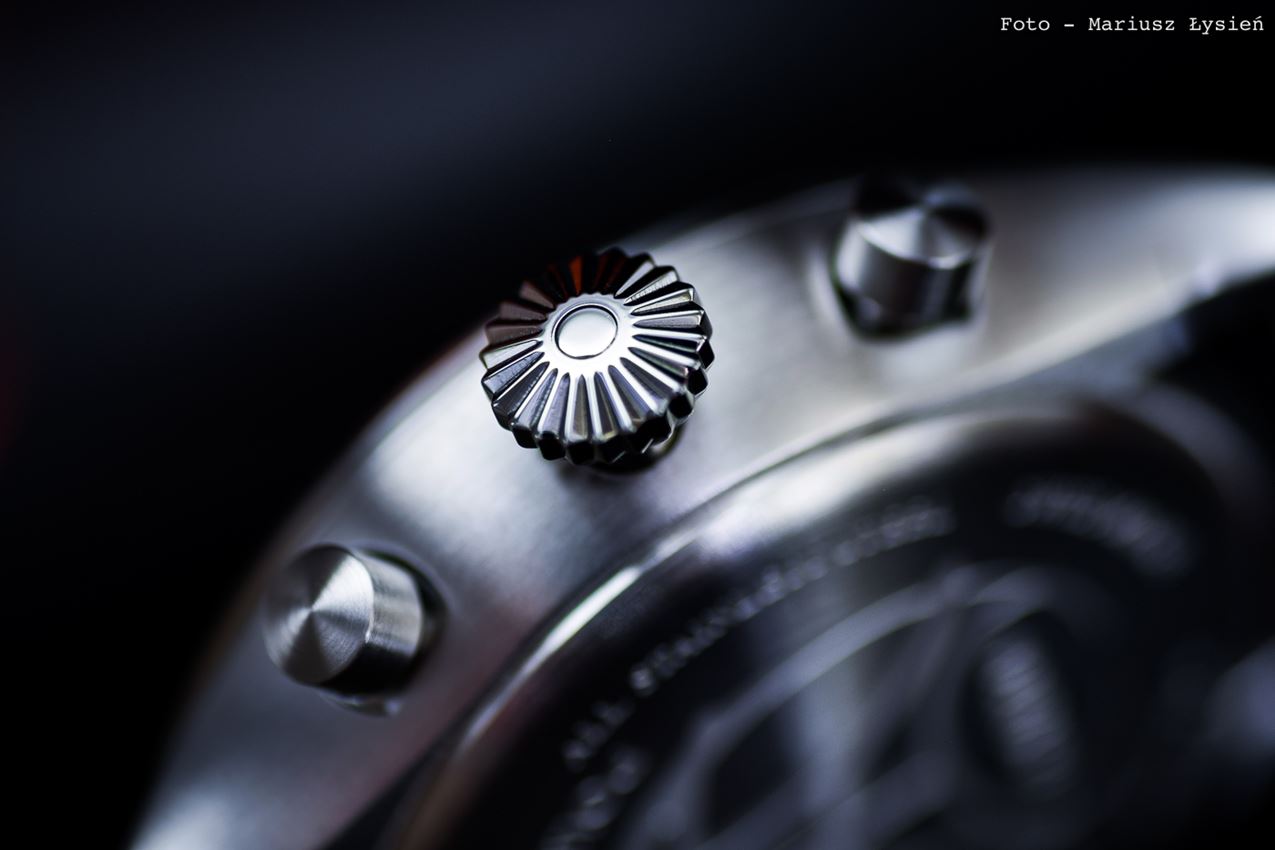 Po prawej stronie koperty umieszczono elementy umożliwiające dokonanie nastaw i obsługę funkcji zegarka. To koronka w kształcie diamentu, o dobrze dobranej wielkości, oraz proste przyciski. Zegarek ma klasę wodoszczelności do 50m. To wystarczająco, choć w takim sportowym modelu nikogo nie zmartwiłoby „wyśrubowanie” tego poziomu choć do 100m.