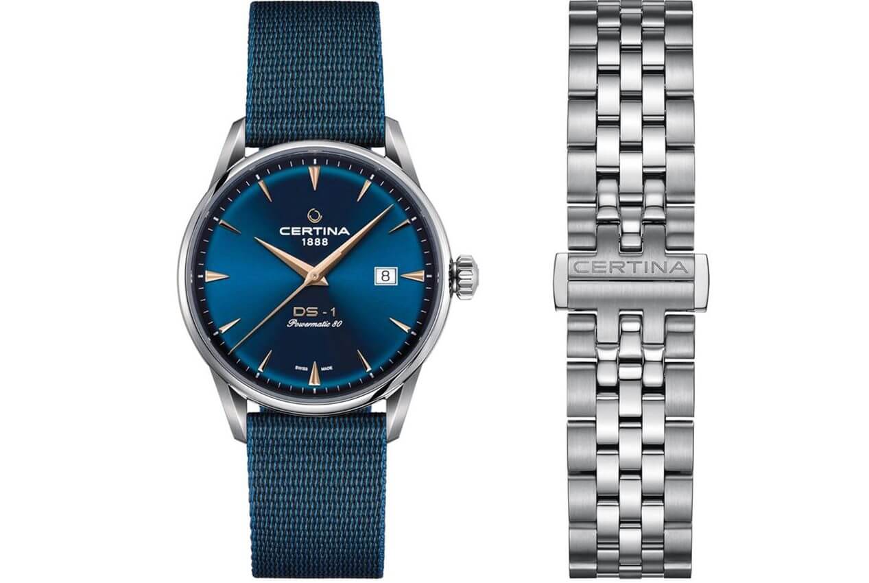 Modele Certina DS-1 Powermatic 80 z tarczami w kolorze niebieskim i szarym mają bransolety ze stali szlachetnej o splocie mediolańskim, z pięcioma rzędami ogniw, z zapięciem motylkowym, oraz paski tekstylne wykonane z materiału #tide ocean material® ze sprzączką. Wariant z brązową tarczą ma także bransoletę i brązowy pasek ze skóry lakierowanej.