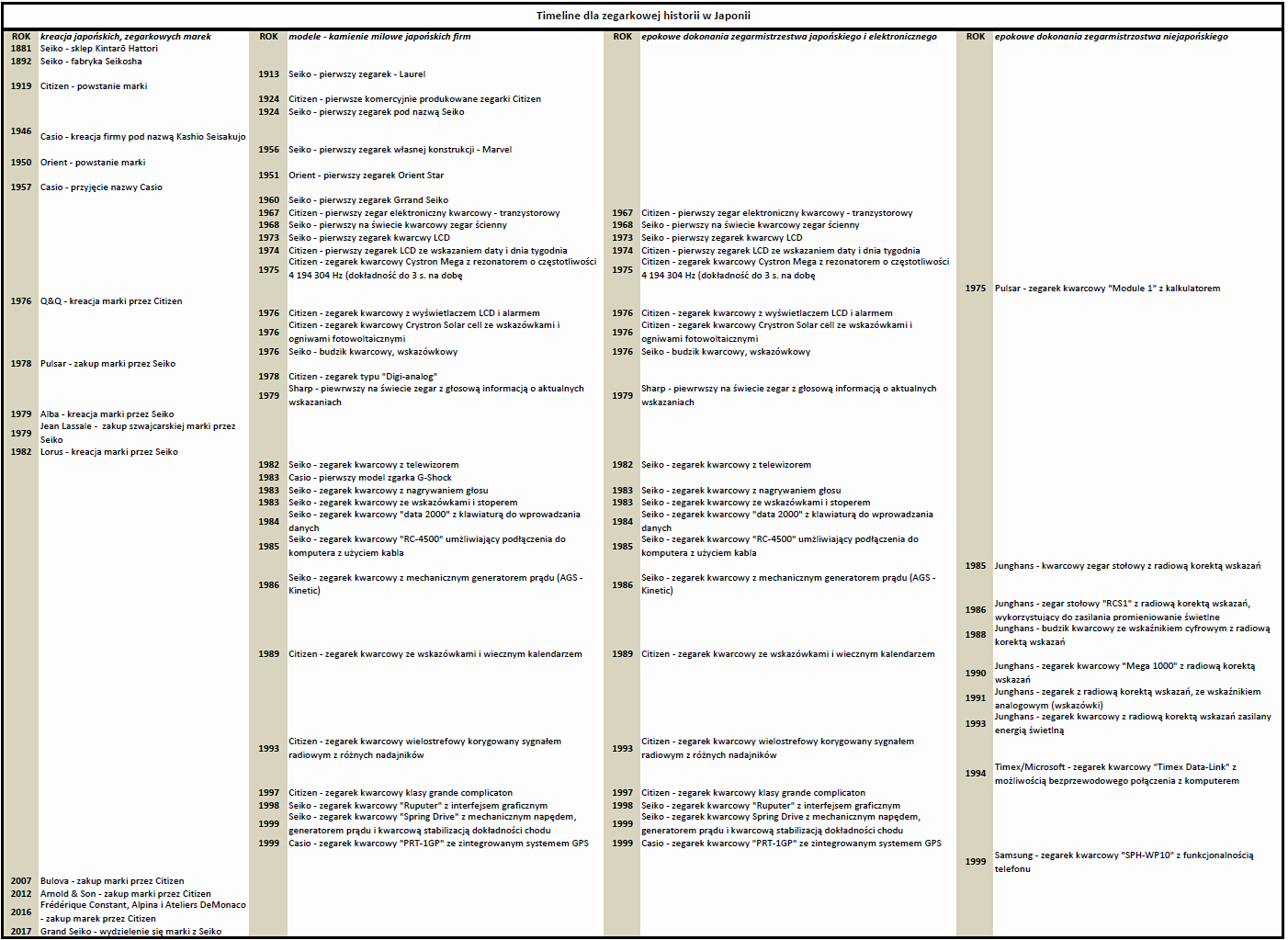 Spoglądając na przedstawione powyżej w formie tabeli kalendarium japońskiego przemysłu zegarkowego do końca poprzedniego wieku, możemy podzielić go na wyraźnie wydzielone okresy (tabela zawiera wiele dat oraz informacji, które zaprezentowane w jednym zestawieniu dają ogląd sytuacji, dlatego aby się z nią zapoznać polecamy przeglądanie jej korzystając z przybliżenia).