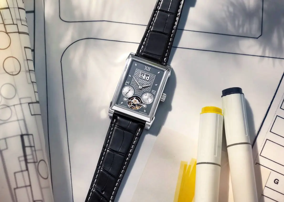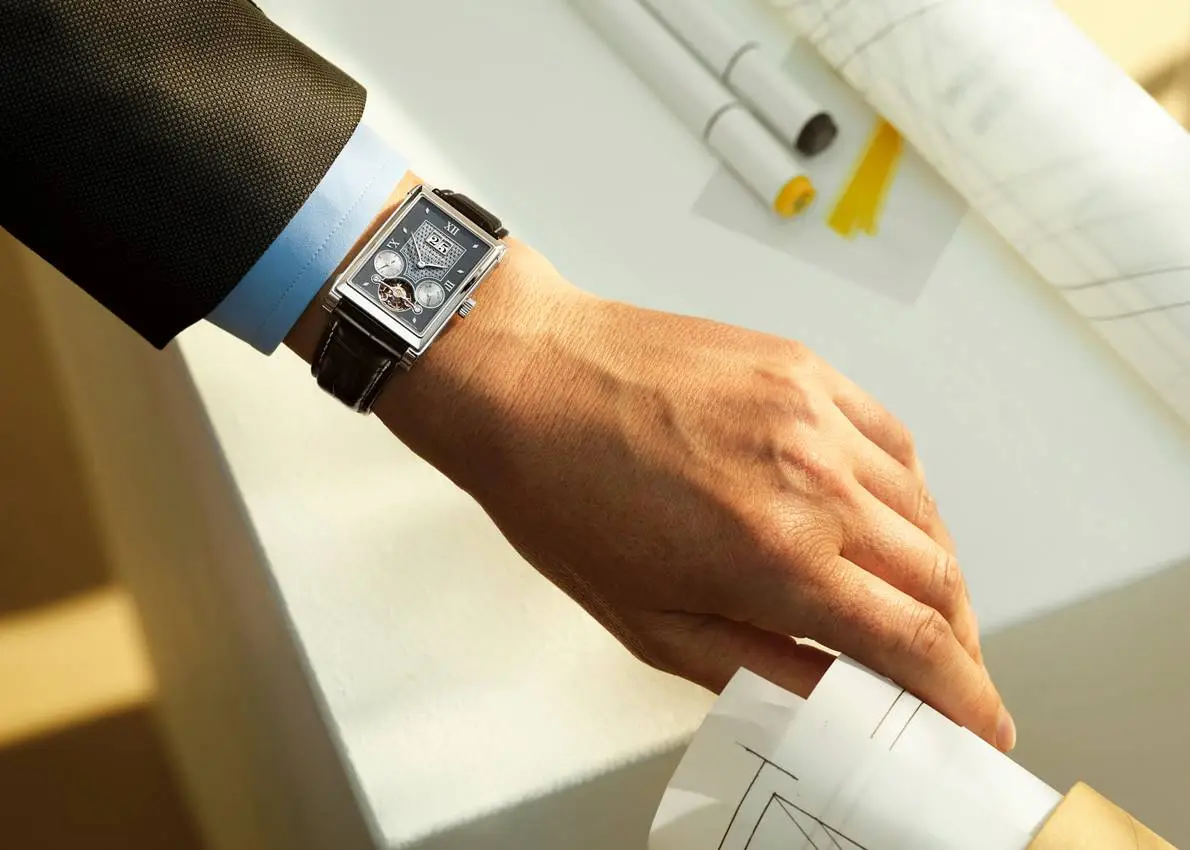 Prostokątna koperta zegarka ma 39,2 mm wysokości i grubość 10,2 mm, a wykonana została z platyny. Ma ona z profilu lekko zagięty kształt, co poprawia dopasowanie do nadgarstka. Pasek ze skóry naturalnej jest w kolorze czarnym, wykonano go ze skóry aligatora, a jego zapięcie stanowi klamra także wykonana z platyny.