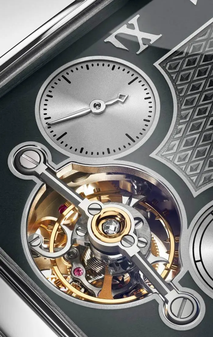Dodatkowo, na godzinie 3:30., jest zlokalizowana mała tarcza ze wskazaniem rezerwy chodu, a po przeciwnej stronie, na godzinie 8:30., mamy tarczę małego sekundnika. Pomiędzy nimi, nieco niżej, jest otwór w którym widzimy pracę hipnotyzującego tourbillon.