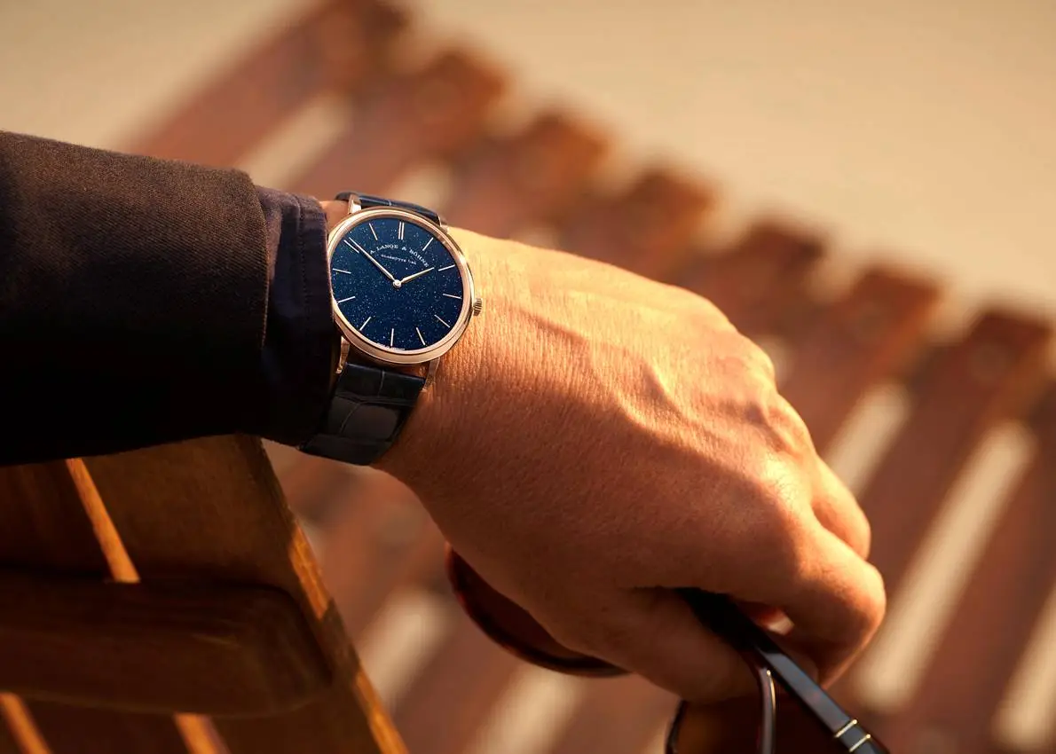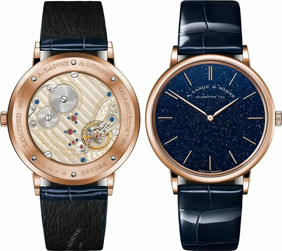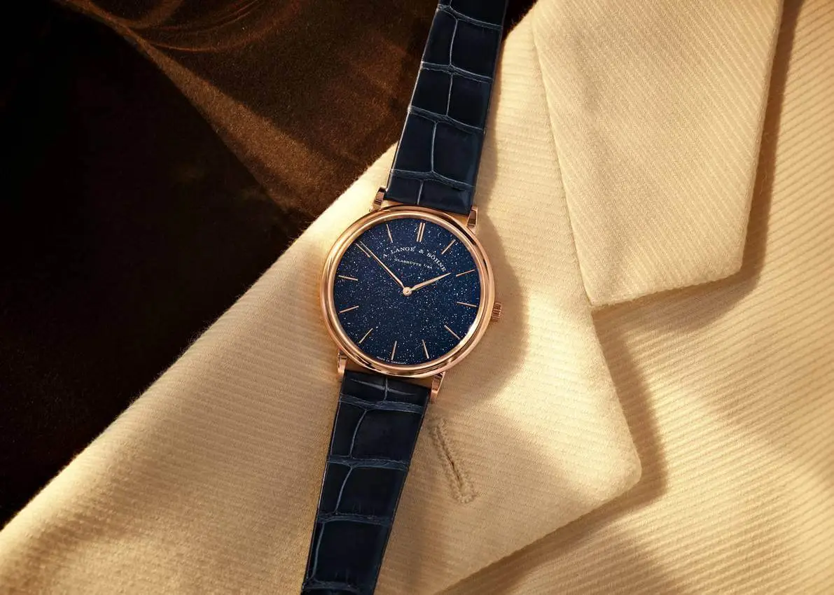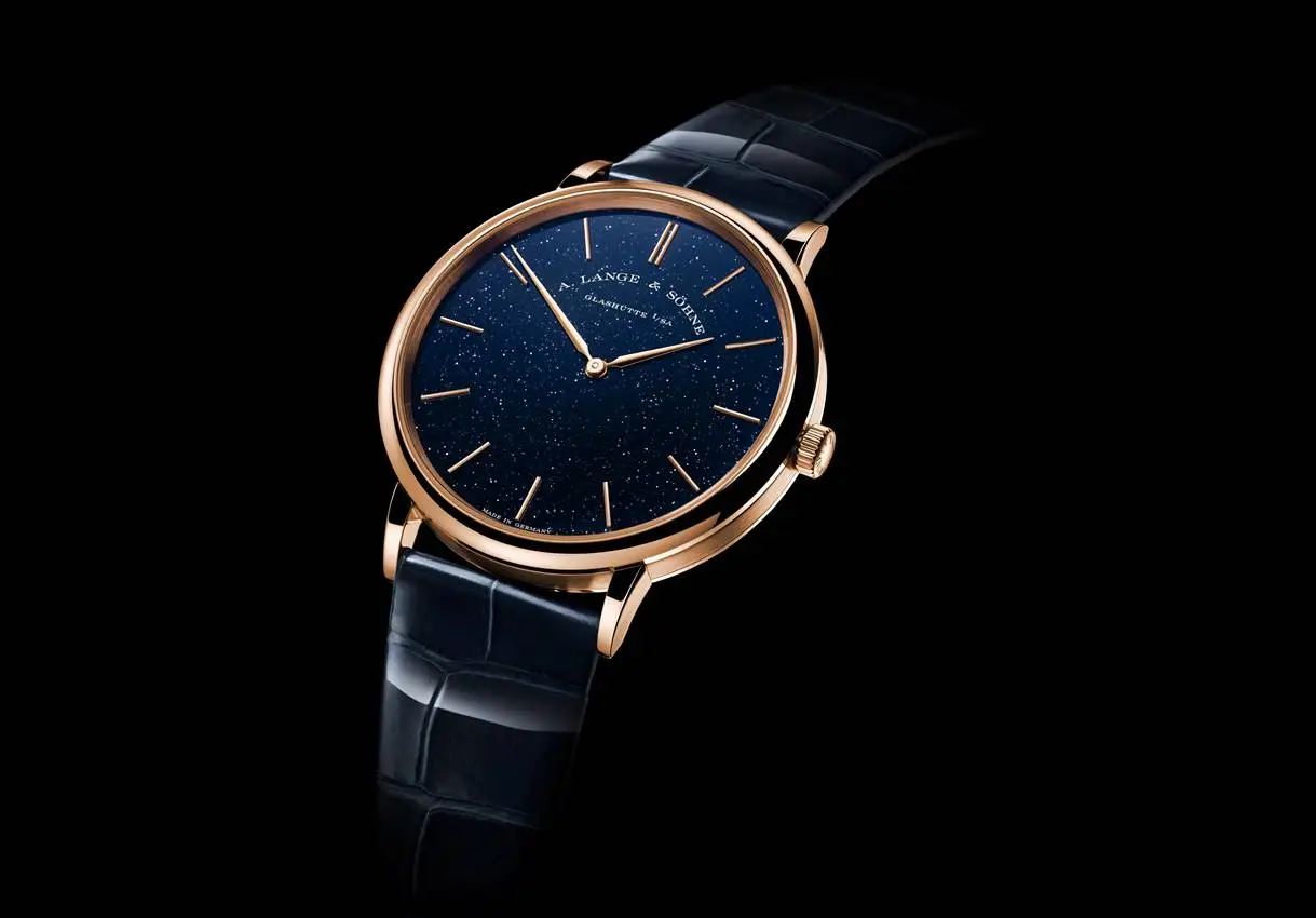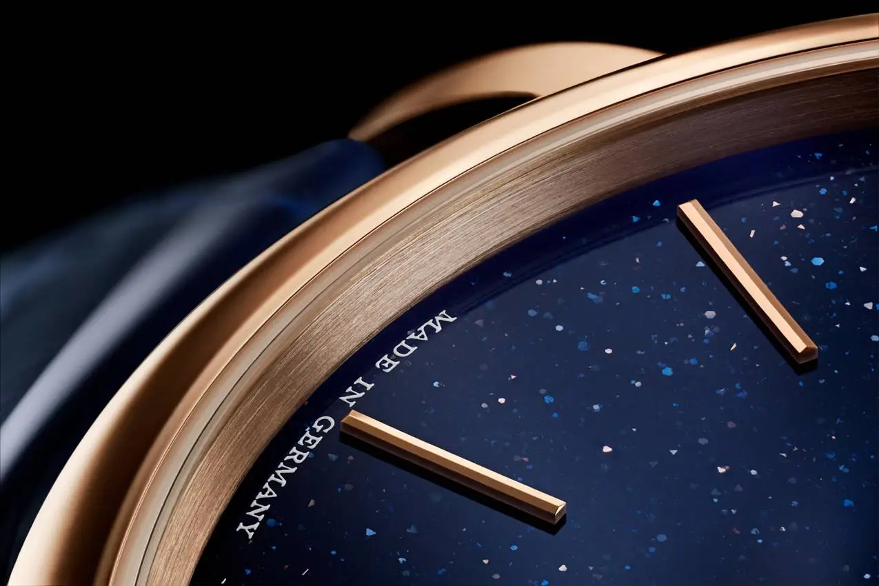 Saxona Thin to prosty, elegancki model zegarka oferowany w okrągłej kopercie z prostopadle wyprowadzonymi i delikatnymi uszami. Tegoroczna nowość A. Lange & Söhne ma bardzo ciekawą, ciemnoniebieską tarczę, która jest wykonana z litego srebra, z powierzchnią o niebieskim kolorze z zatopionymi drobinkami złota.