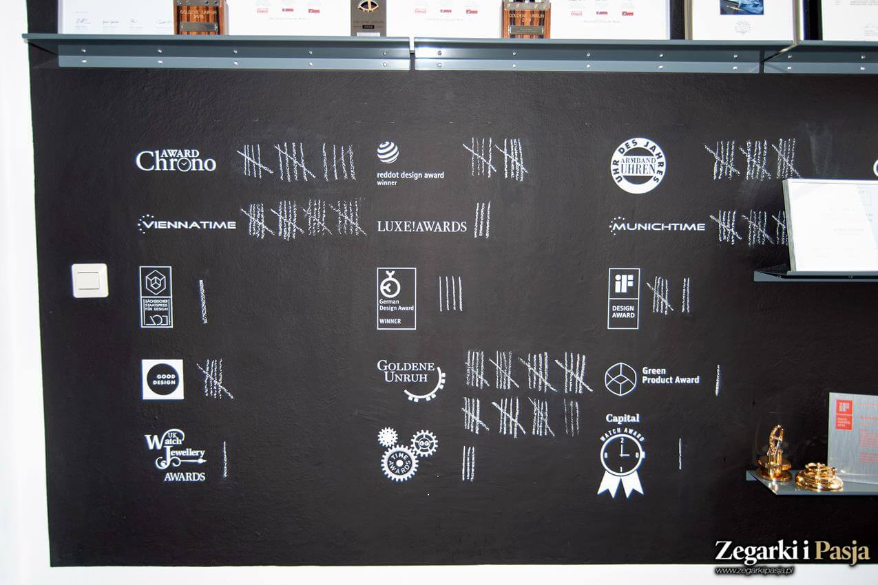 Niestety ze względu na to, że tam również sprawdzane są prototypowe zegarki, nie można było fotografować tego miejsca. Przechodząc dalej, przed wejściem do kolejnego pokoju znajduje się specjalna ściana z różnego rodzaju nagrodami zdobytymi przez tę niemiecką markę. Tak zwany „wall of fame & glory”.