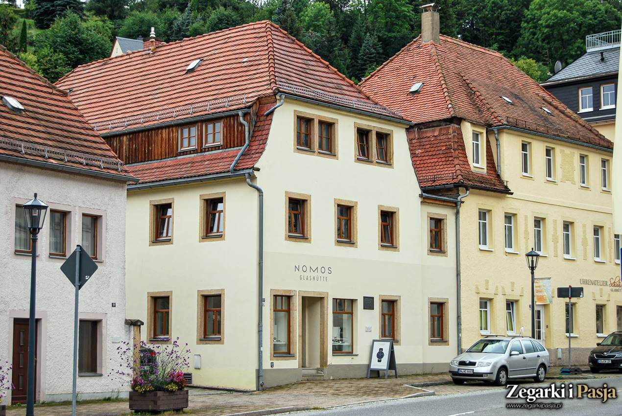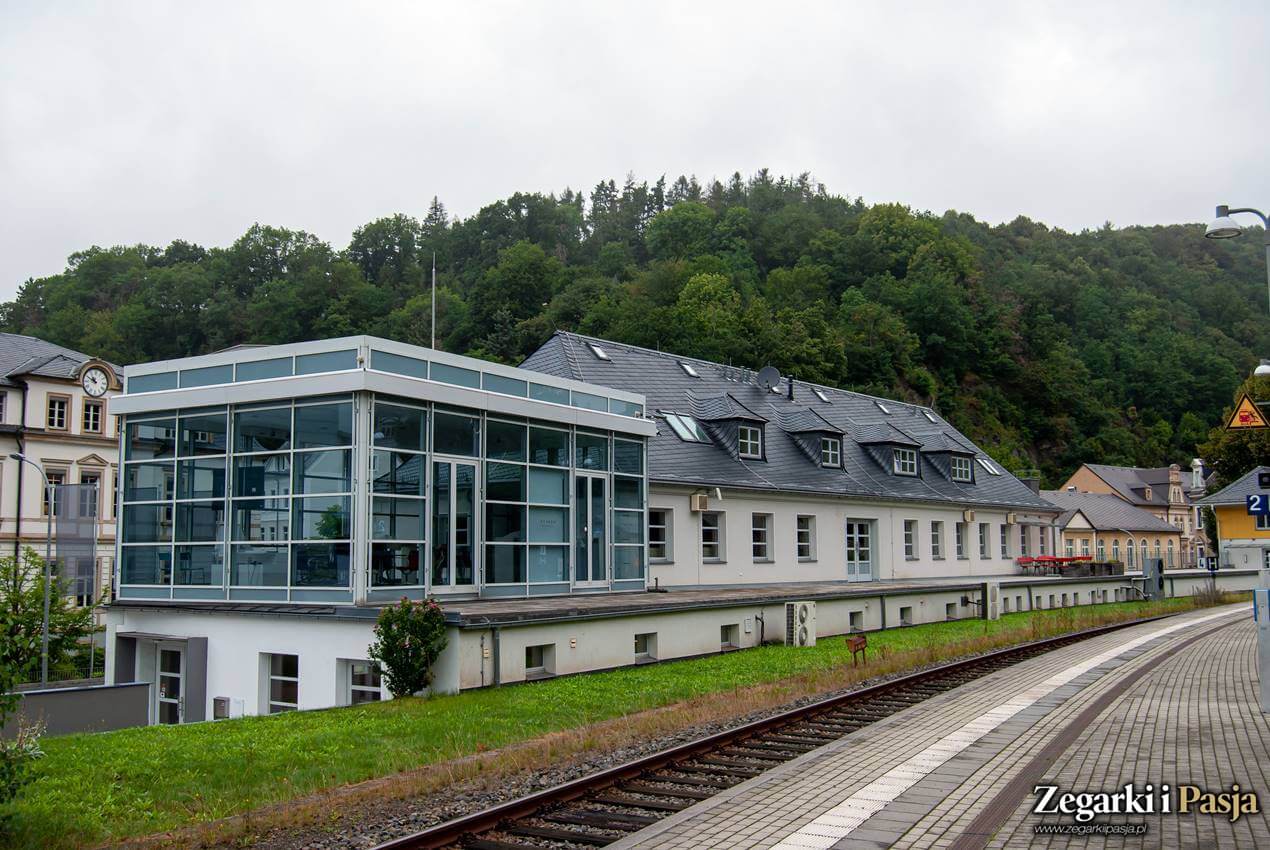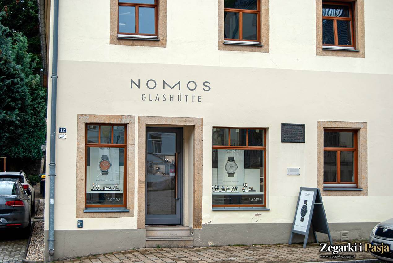 Już po wyjściu na peron można poczuć się jak w zegarkowym raju - z jednej strony widzimy budynek marki Moritz Grossmann, a z drugiej Glashütte Original i właśnie NOMOS.