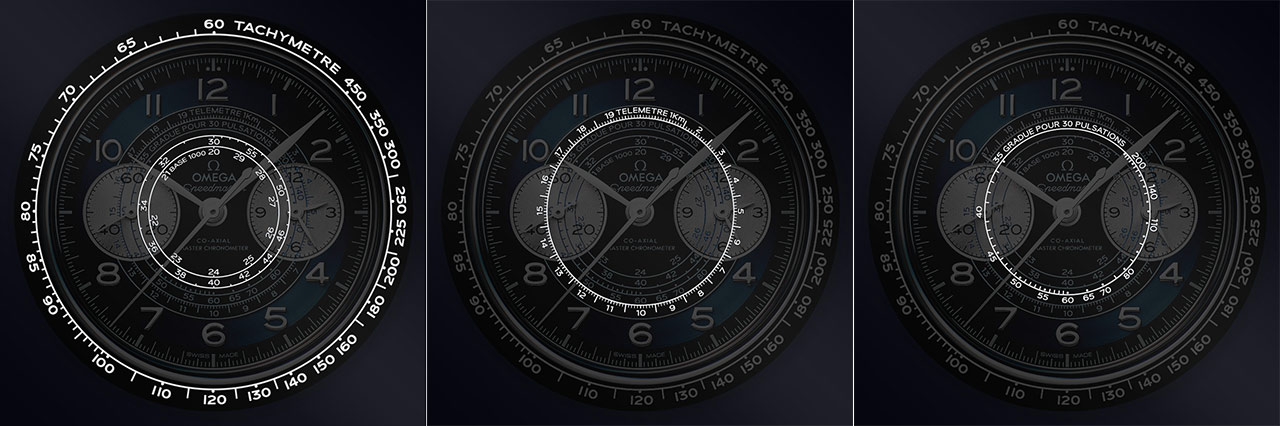 Także w centralnej części tarczy znajdziemy skalę telemetru, dzięki której przy włączonym stoperze jesteśmy wstanie ustalić np. odległość od źródła dźwięku, oraz pulsometru, ułatwiającą zbadanie pulsu. Nowy zegarek Omega Speedmaster Chronoscope ma także skalą tachometru, ułatwiającą określenie prędkości, która znajduje się w tradycyjnym dla Speedmastera miejscu, czyli na wkładce lunety.