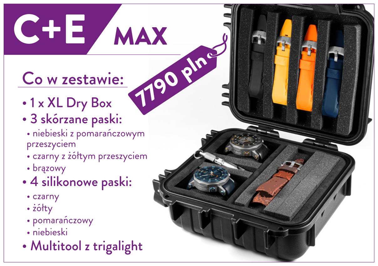 - C+E MAX – dwa zegarki o nr referencyjnych PX84-620H658 + PX84-620H659, XL Dry Box, 3 paski skórzane, 4 paski silikonowe, multitool z trigalight. Zestaw w cenie 7 790 złotych.