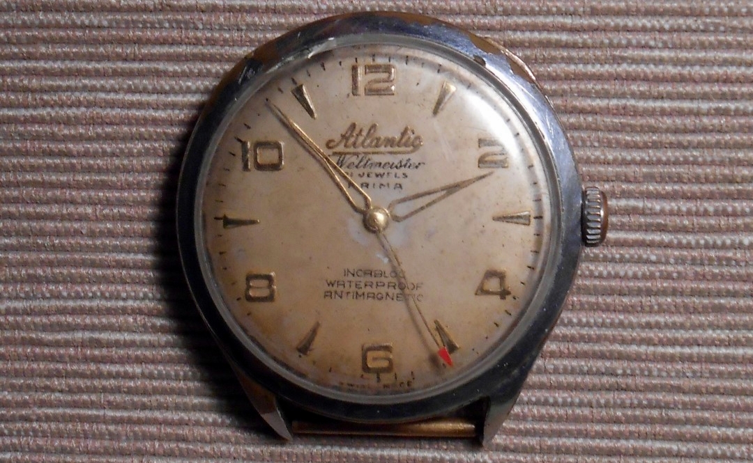 Tata badawczo na mnie spojrzał i powiedział, że za sześć lat dostanę coś z jego zbiorów, ale decyzja chyba zapadła już teraz. Zegarek nie wyglądał zbyt okazale. Miał pożółkłą tarczę z napisem Atlantic Worldmaster Super-Extra 21 jewels, zbite szkiełko i wyposażony był w tandetną bransoletę, która raziła od samego otwarcia pudełka przez tatę. Z czasem dowiedziałem się, że zegarek miał swoje „pięć minut„ w rękach stryja, starszego brata mojego taty, który nie miał w zwyczaju dbać o przedmioty, które ułatwiają mu życie, a dodatkowo mają sentymentalną duszę.