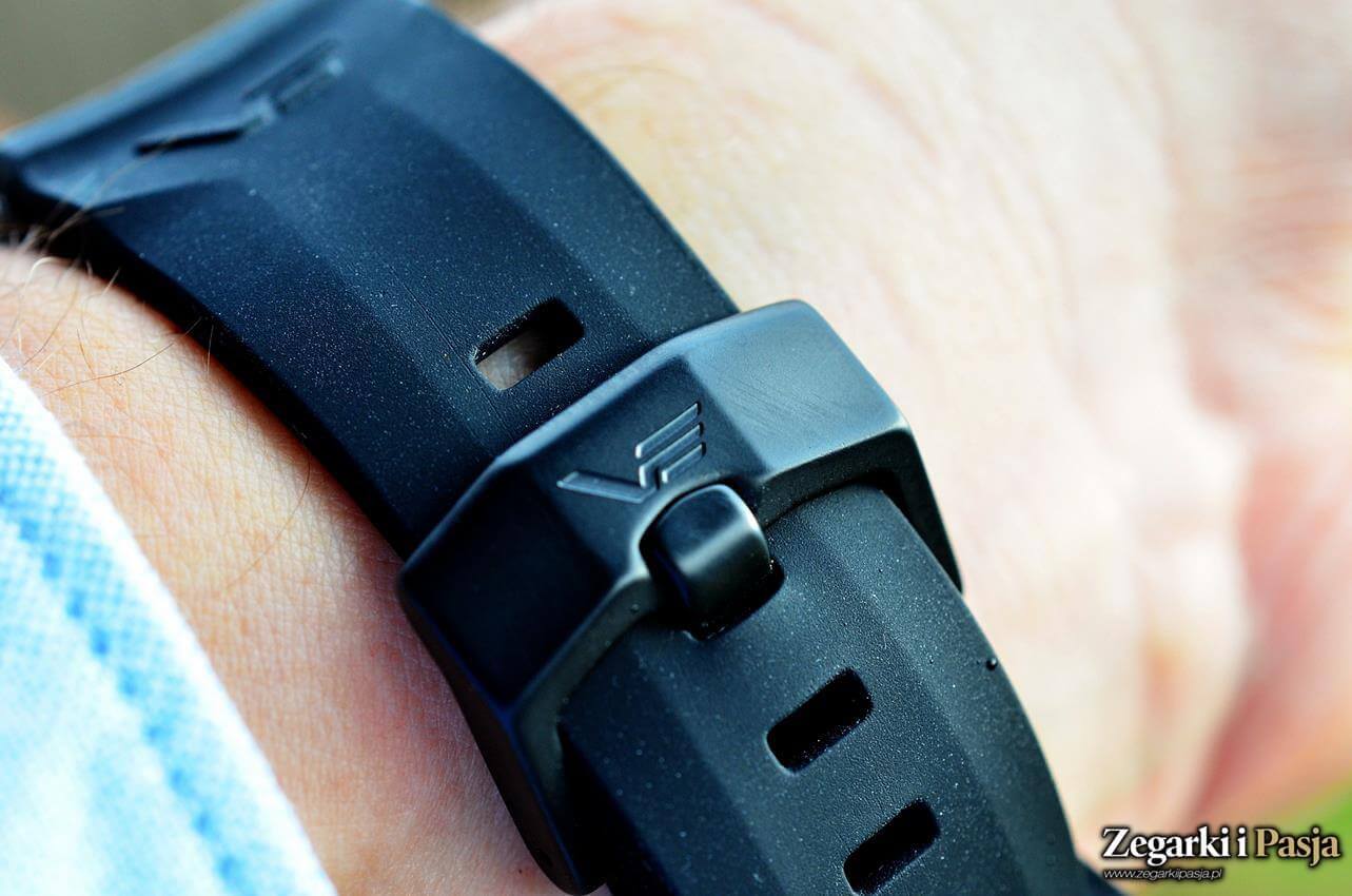 Pomiędzy uszami mieści się pasek o szerokości 24 mm. Litewska firma na start zaopatruje klienta, który zakupi Vostok Europe Engine Skeleton Limited Edition Automatic w dwa paski. W przypadku wykorzystania zegarka do nurkowania i sportowych stylizacji jest pasek silikonowy. Jest on bardzo miękki i wygodny, ma przy mocowaniu z każdej strony „harmonijkową” część pozwalającą się właściwie odkształcić w razie narażenia na wysokie ciśnienia. Pasek jest na tyle długi, ze można go zapiąć na piance do nurkowania, a szlufka ma specjalną wypustkę stabilizująca ją we właściwym miejscu. Zapinany jest na klasyczną klamrę z pinem. Ma też wadę, która jest cechą każdego paska z tego materiału - to przyciąganie kurzu.
