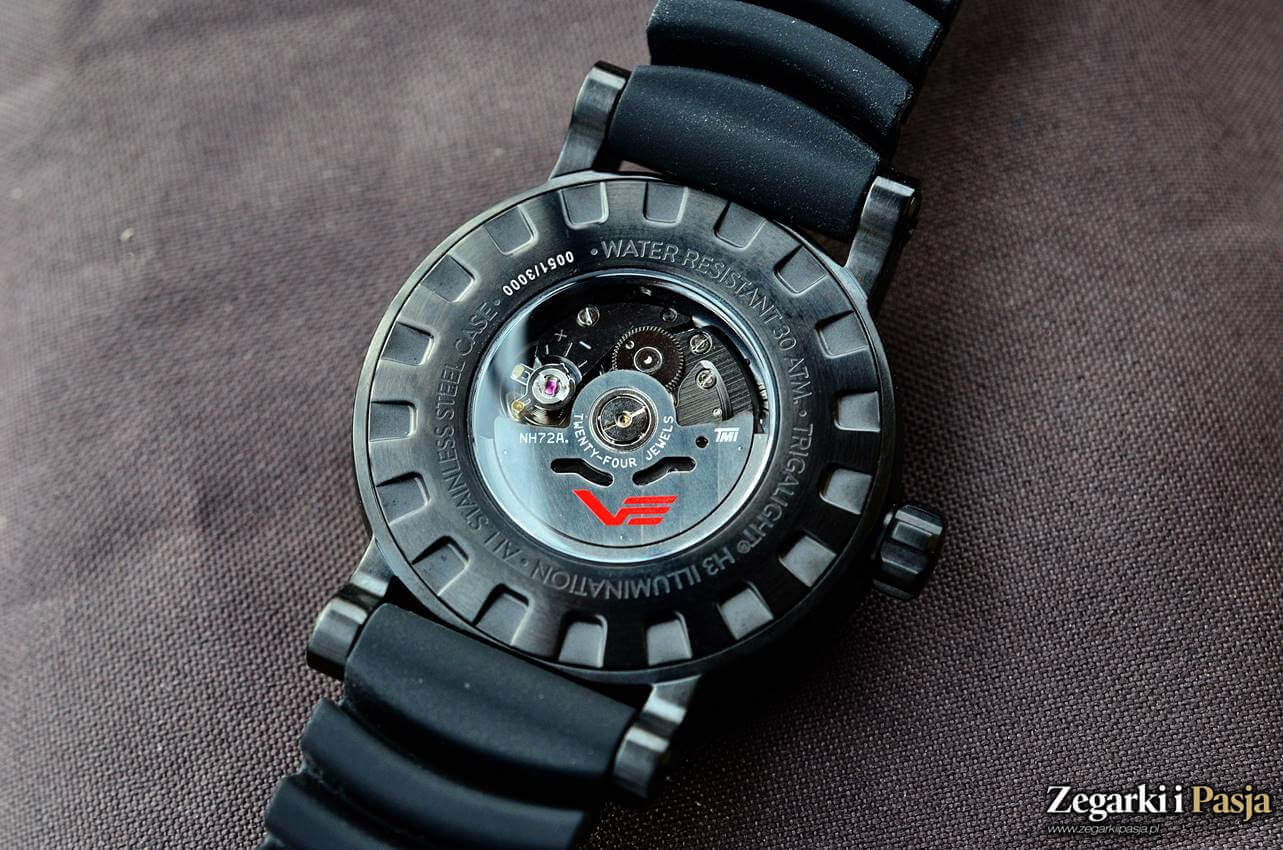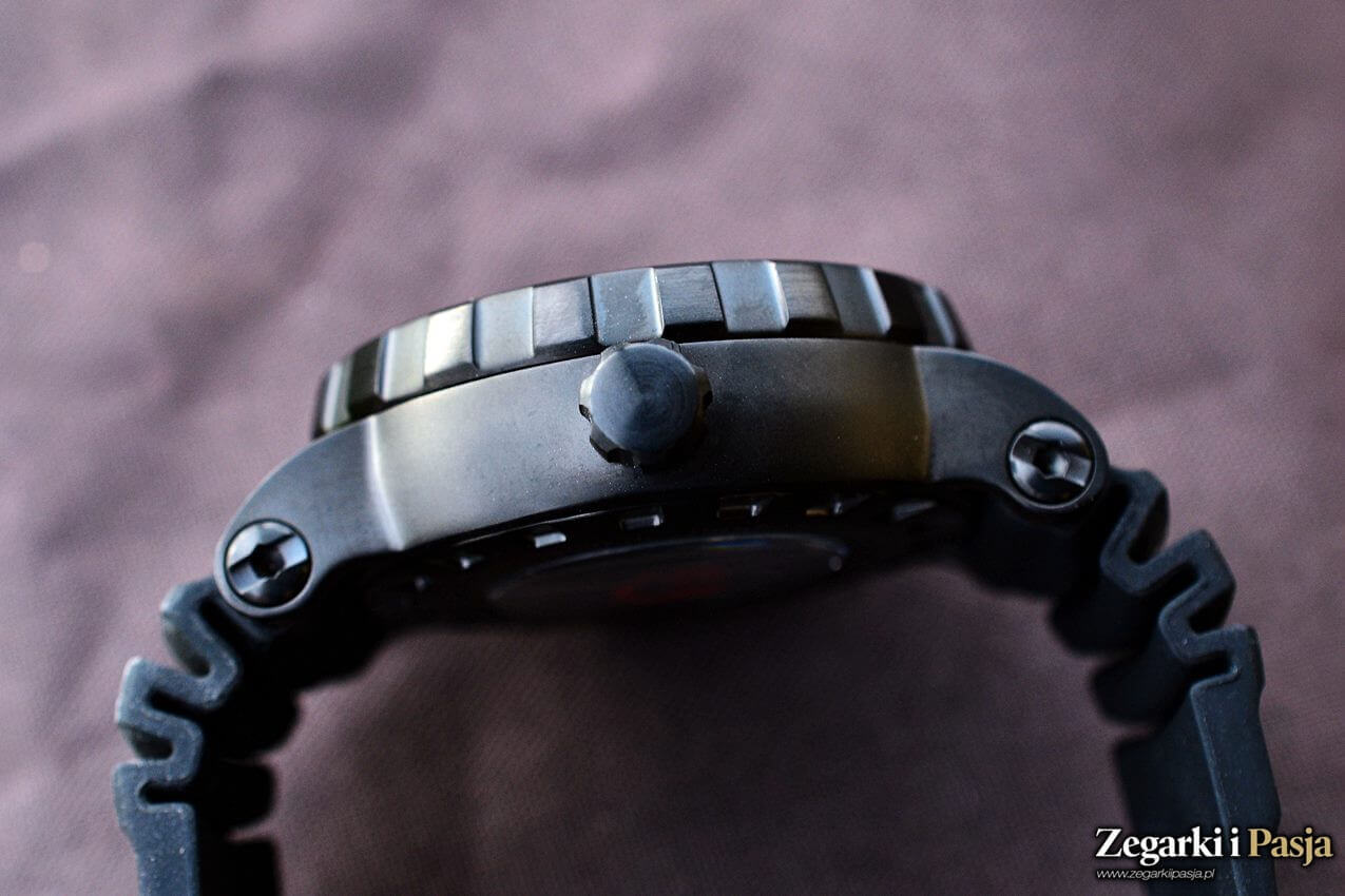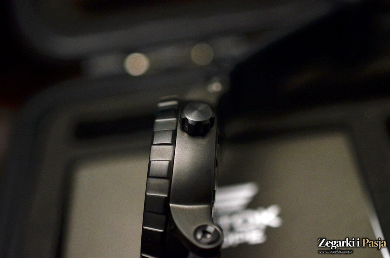 Wokół przeszklenia wygrawerowano informacje o tym modelu zegarka w raz z numerem danego egzemplarza w limitowanej do 3000 sztuk serii. Umieszczona tradycyjnie, na godzinie 3. koronka jest duża i wkręcana. Szkoda, że nie przyozdobiono jej czołowej części logiem producenta. Wspomniana obrotowa luneta jest wysoka, choć raczej niezbyt szeroka od frontu, gdzie umieszczono ukośnie ustawioną, aluminiową wkładkę ze skalą nurkową.