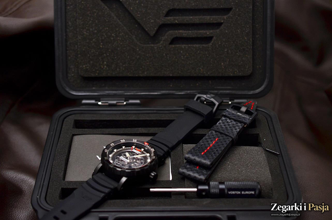 Zegarek Vostok Europe Engine Skeleton Limited Edition Automatic otrzymujemy w bogatym zestawie, którego elementy wymieniłem. Wszystko otrzymujemy w kuferku typu dry-box, o wytrzymałej konstrukcji, chroniącym zegarek przed uderzeniami, wstrząsami a także dostępem wody. W jego wnętrzu mieści się poza zegarkiem, dodatkowym paskiem i narzędziem do wymiany jeszcze dokumentacja, oraz - jako bonus - arkusz naklejek z logo marki Vostok Europe. Producent udziela 2 letnie gwarancji na swój zegarek.