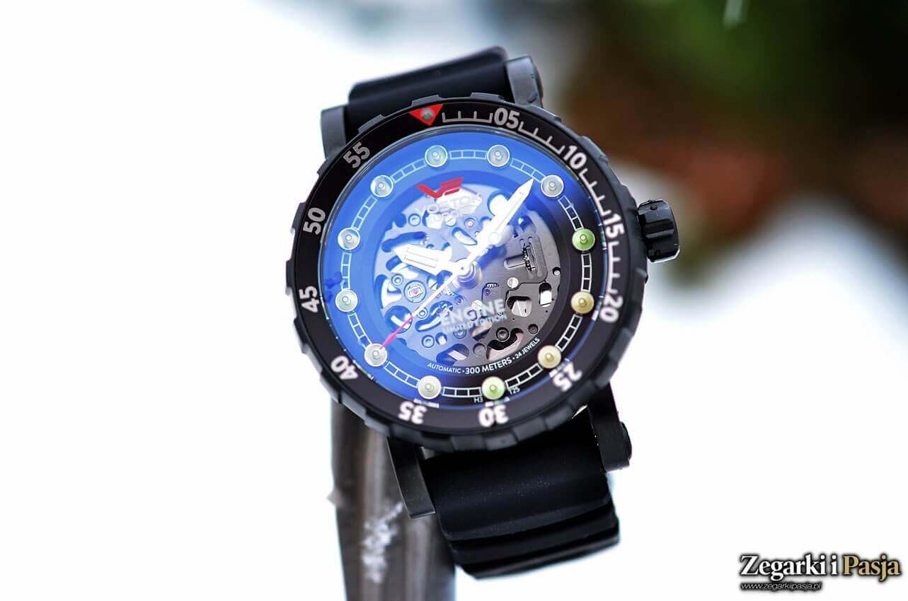 Jak każdy model tej firmy, także Engine Skeleton Limited Edition Automatic jest wyjątkowy i od samego początku robi wrażenie. Także sporym rozmiarem. To pierwszy zegarek tej marki ze szkieletowanym mechanizmem. To cała nowa kolekcja składająca się na dziś z trzech wersji: jest wariant ze stalową kopertą, z kopertą w kolorze różowego złota oraz w kolorze czarnym. Do nas trafiła ta ostatnia wersja, która w mojej ocenie jest najatrakcyjniejsza z tej trójki.