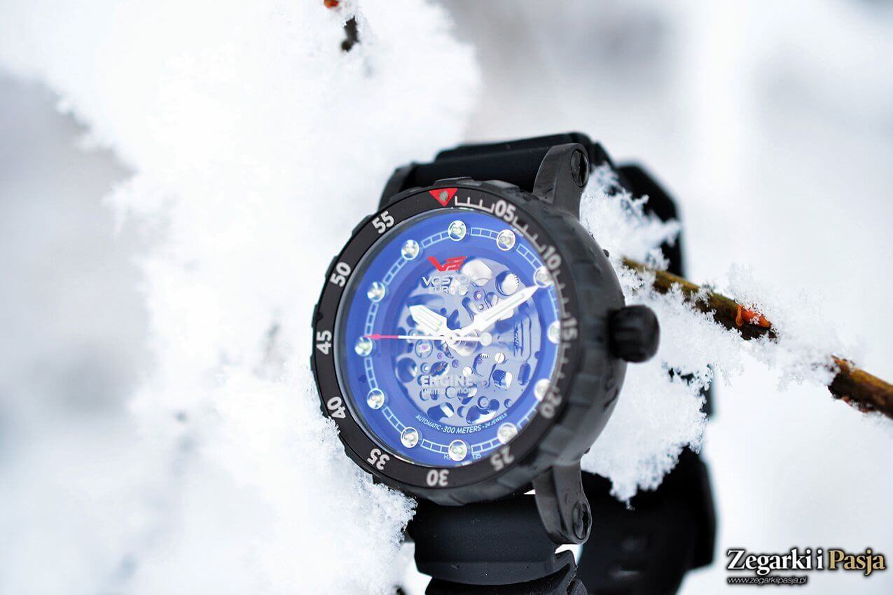 Jeśli chodzi o parametry techniczne i możliwości, to zegarek ten jest bezkompromisowym diverem. To sportowy model o solidnej kopercie i klasie wodoszczelności do 300 metrów. Jednakże brak tradycyjnej tarczy i szkieletowanie to nieczęsto widywane rozwiązanie w takich zegarkach. Jest oczywiście obrotowa luneta ze skalą nurkową i zapewnienie dobrej czytelności w złych warunkach dzięki zastosowaniu podświetlenia trytowego, ale o tym nieco później.