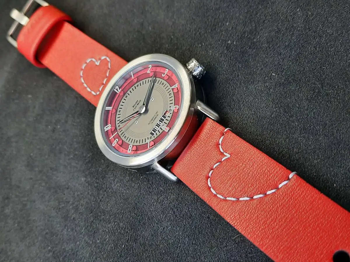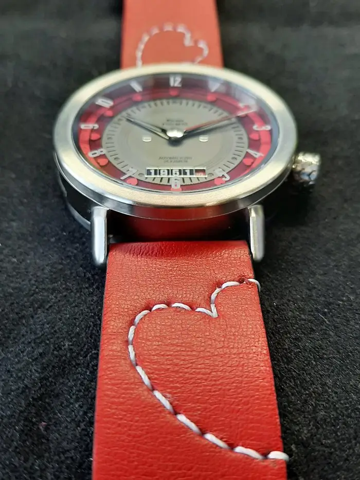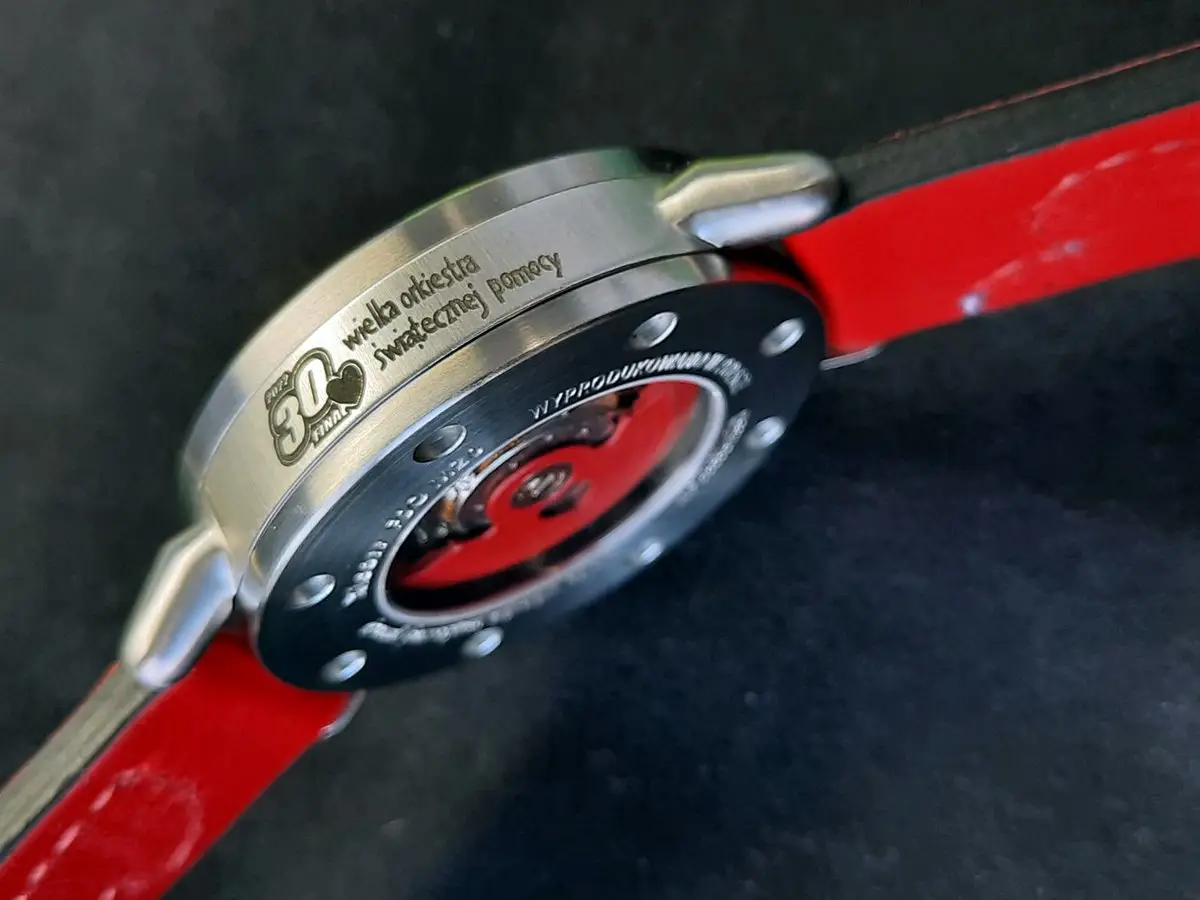Do zegarka przygotowano specjalny czerwony pasek. Wykonała go ceniona firma Pattini. Poza kolorem odnoszącym się do szczytnej akcji ma on przeszycia na obu częściach, wykonane biała nicią w kształcie a jakże, serduszek. Warto dodać jeszcze, iż wszystkie opisane powyżej modyfikacje zostały przeprowadzone w Polsce, a w tworzenie tego zegarka zaangażowanych było aż sześć firm.
