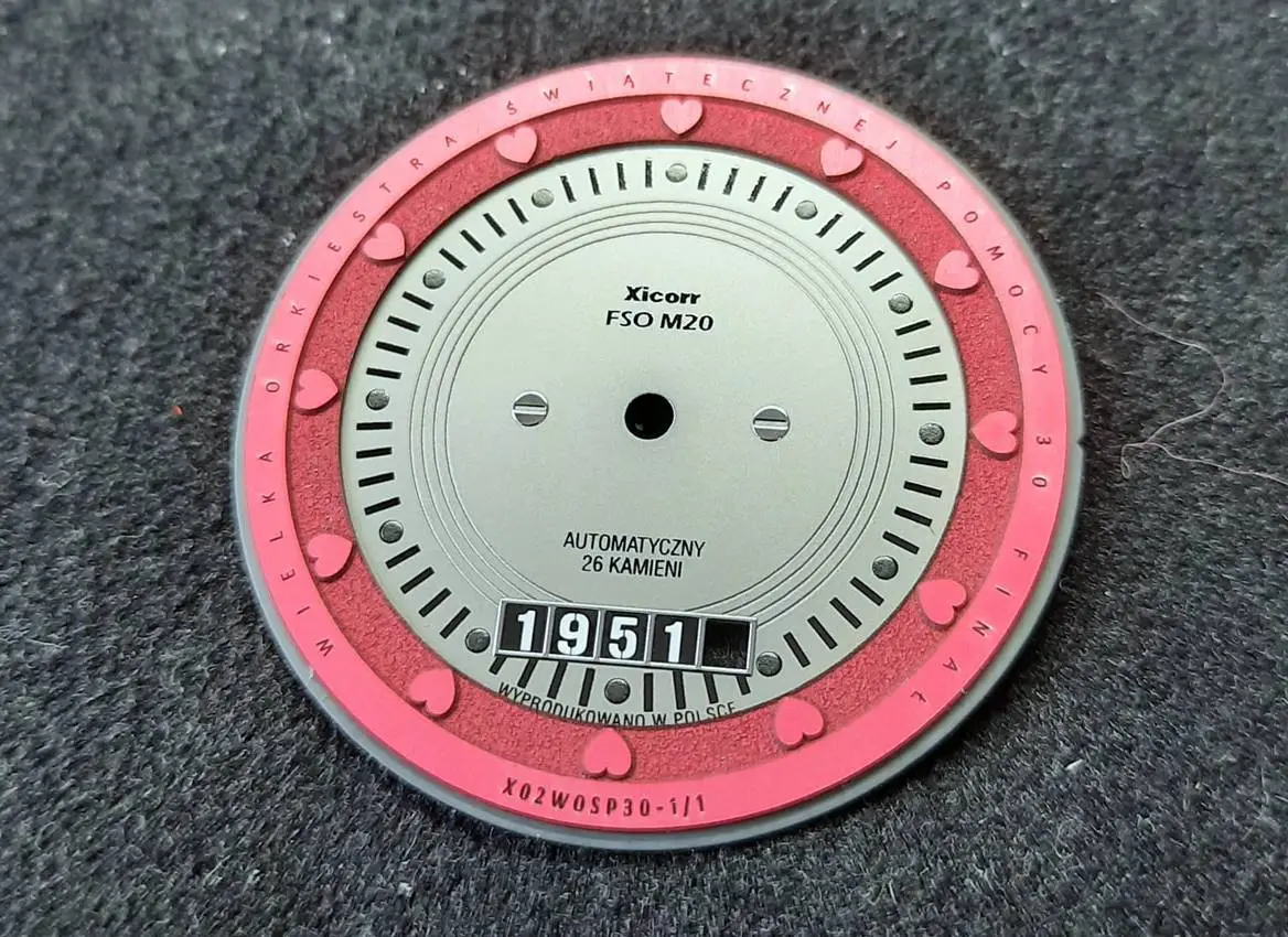 Świetnie to wygląda, tym bardziej, że na tarczy drugi „komplet” indeksów to nakładane, czerwone serduszka odnoszące się do symbolu WOŚP, osadzone na czerwonym pierścieniu o chropowatej strukturze. Bardziej na zewnątrz od tej części jest położony nieco wyżej, także czerwony, ale gładki pierścień na którym jest wygrawerowany napis Wielka Orkiestra Świątecznej Pomocy dookoła, a na dole jest skrót XO2WOSP30, oznaczający edycję zegarka Xicorr da 30 finału WOŚP no i ten numer w limitacji 1/1.