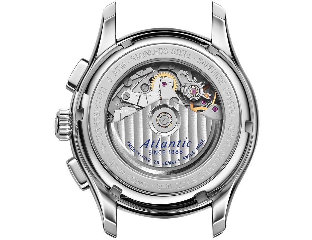 Realizacja ich wszystkich możliwa jest dzięki zastosowaniu mechanizmu Valjoux kaliber 7750 z automatycznym naciągiem sprężyny. Jest on widoczny przez mineralne szkło znajdujące się na deklu zegarka. Patrząc na mechanizm nie znajdziemy intensywnego zdobienia, jednak na wahniku znajdziemy pasy genewskie stanowiące tło dla nazwy marki w tym miejscu umieszczonej.