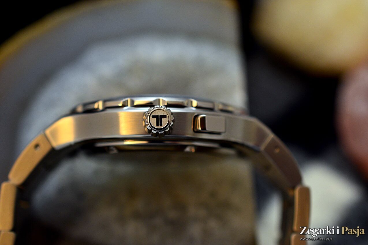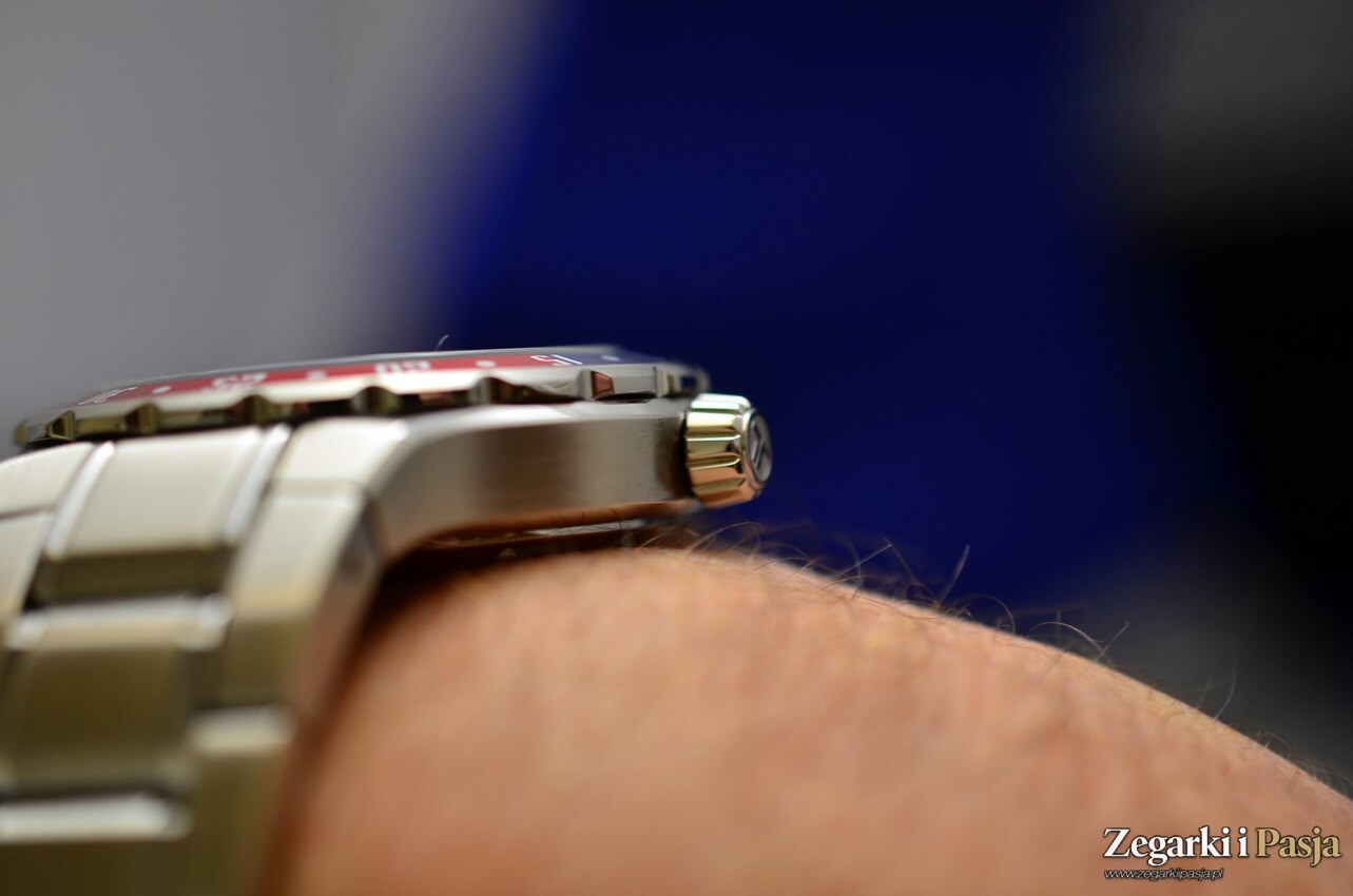 Nowocześnie zaprojektowana, zwężająca się ku części czołowej koronka na godzinie trzeciej dodaje zegarkowi charakteru. Służy ona oczywiście do ustawiania i korygowania wskazania czasu w pierwszej pozycji, a gdy odciągniemy ją do drugiej pozycji wówczas służy do korekty wskazania datownika. Ciekawostką jest podłużny przycisk widoczny na godzinie drugiej służący do … o tym za chwilę.