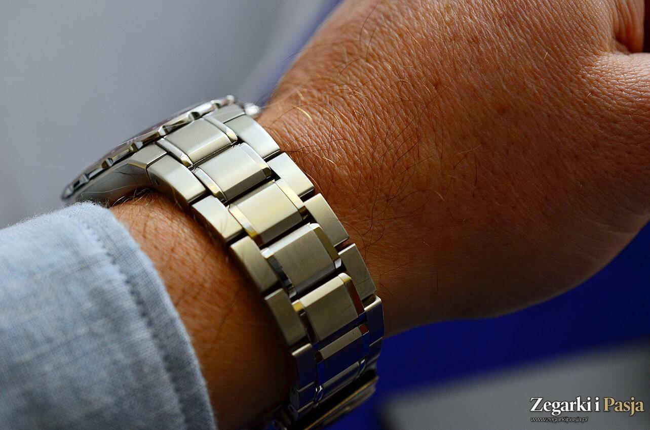 Na zabezpieczającej klamrę zapadce wygrawerowano nazwę firmy. Mimo, że ogniwa są dość duże, to bransoleta całkiem dobrze układa się na nadgarstku. Jej zaletą jest także sposób w jaki jest mocowana do bransolety - bardzo blisko, dzięki czemu od razu może opadać w dół, co z kolei pozwala na dopasowanie jej nawet do skromnych przegubów.