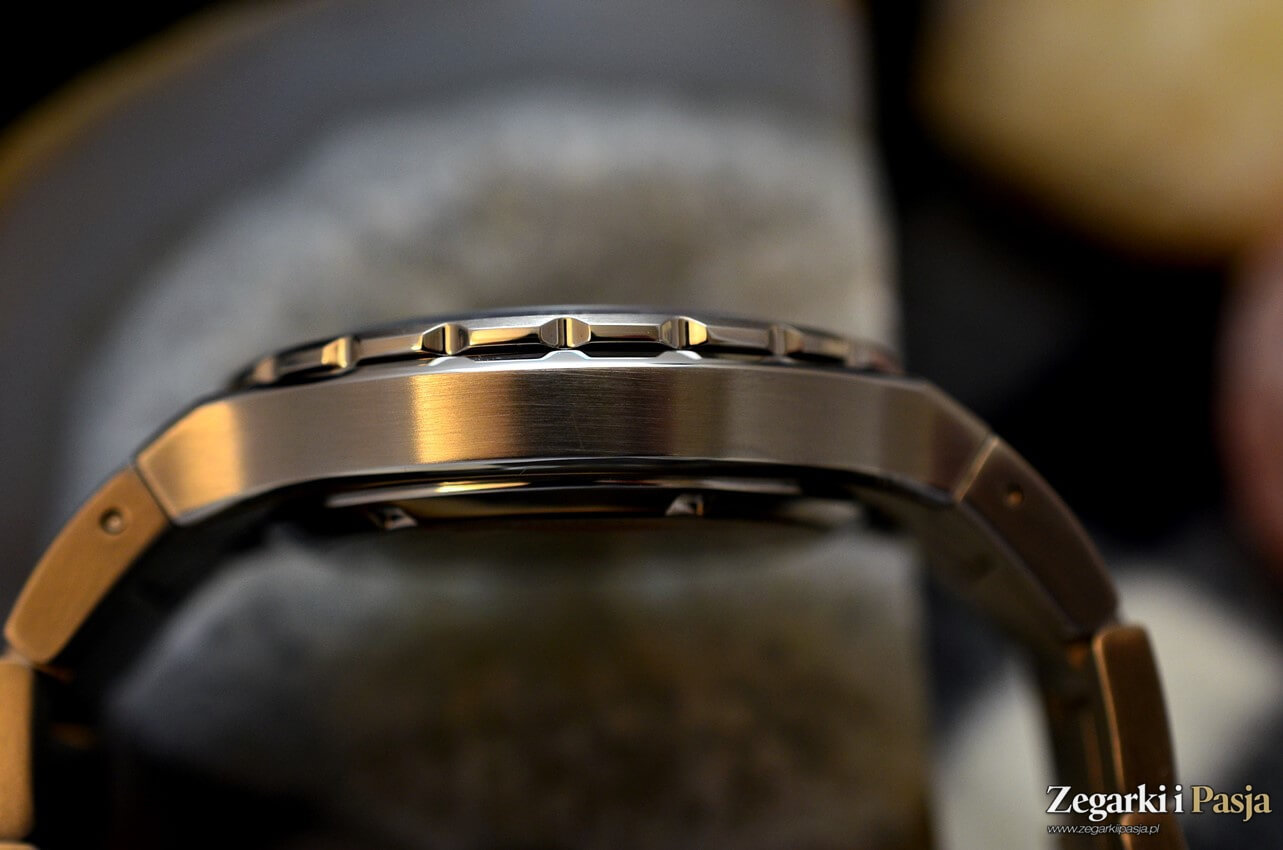 Zintegrowane mocowanie bransolety składa się z pary uszu schodzących się w swoim kierunku, także górnymi powierzchniami, co wizualnie daje efekt lekko ukośnego ich położenia. Górne części koperty wykończono za pomocą szczotkowania. Tak samo boki jak i spód koperty. Miłym zaskoczeniem jest zastosowanie fazowanych krawędzi między płaszczyznami. Powstałe w ten sposób linie, o niewielkiej szerokości, są polerowane na wysoki połysk. Takie rozwiązanie daje atrakcyjny wygląda, a co ważne - nie jest często spotykane w zegarkach oferowanych na tym pułapie cenowym. Utworzone w ten sposób linie styku powierzchni wykończonych w różny sposób nie są być może spektakularnie ostre i wyraziste, ale efekt wizualny jest wystarczająco dobry, szczególnie w perspektywie ceny.