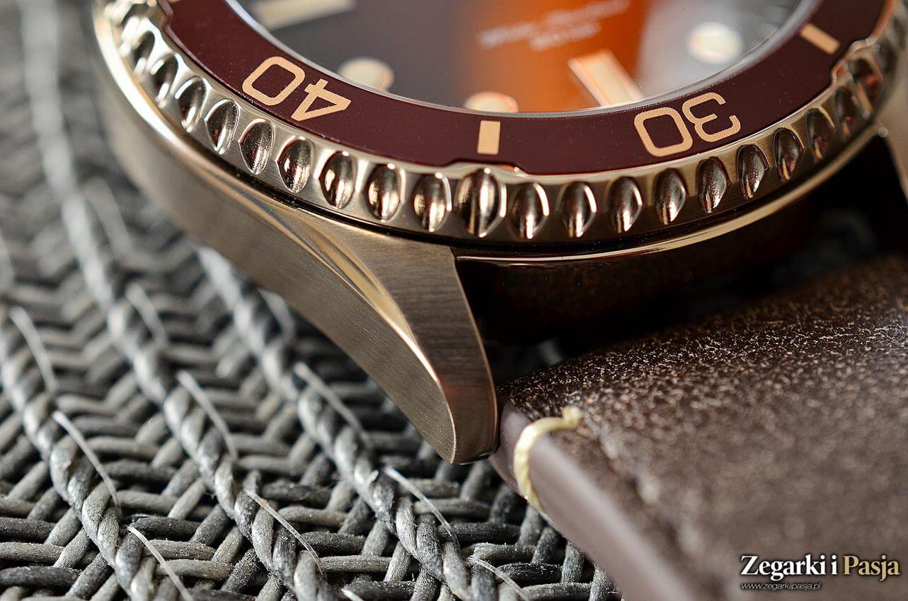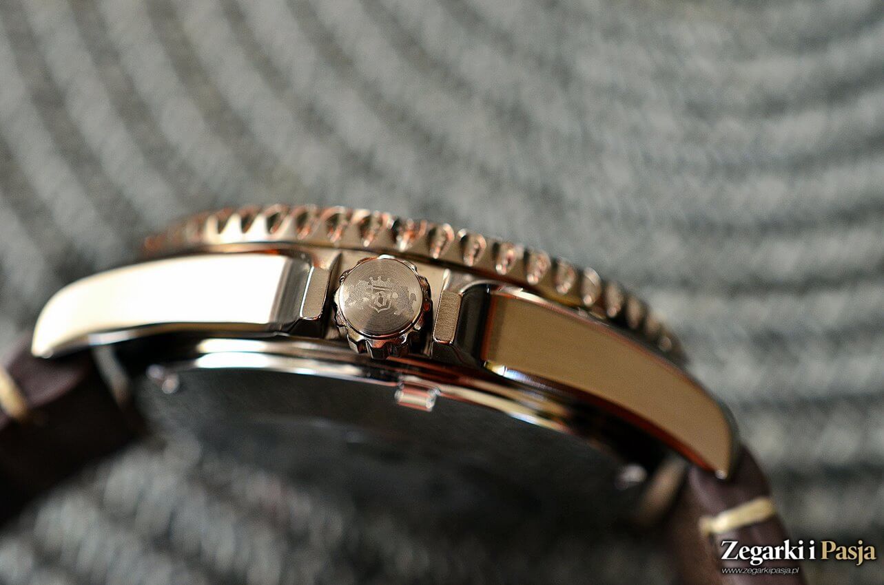 Większość powierzchni koperty jest szczotkowana. Między boczną linią a górnymi częściami uszu przechodzi linia utworzona przez fazowanie i jest ona polerowana. Ciekawy jest kolor koperty - wykonano ją ze stali, ale nałożono powłokę, której kolor jest określany jako brąz. Chodzi oczywiście o metal - brąz. Jednak jest ona jaśniejsza niż typowy kolor tego stopu, co dało taką nietypową, intrygującą barwę świetnie komponującą się z pozostałymi detalami zegarka, które także opiszę w dalszej części. Ale będąc jeszcze przy opisie koperty spójrzmy na pozostałe jej elementy. Z boku, na godzinie 3., są charakterystyczne wypustki osłaniające średniej wielkości, prostą koronkę. Ma ona nacięcia na bokach a jej czołowa część przyozdobiona jest laserowo wygrawerowanym logo marki.