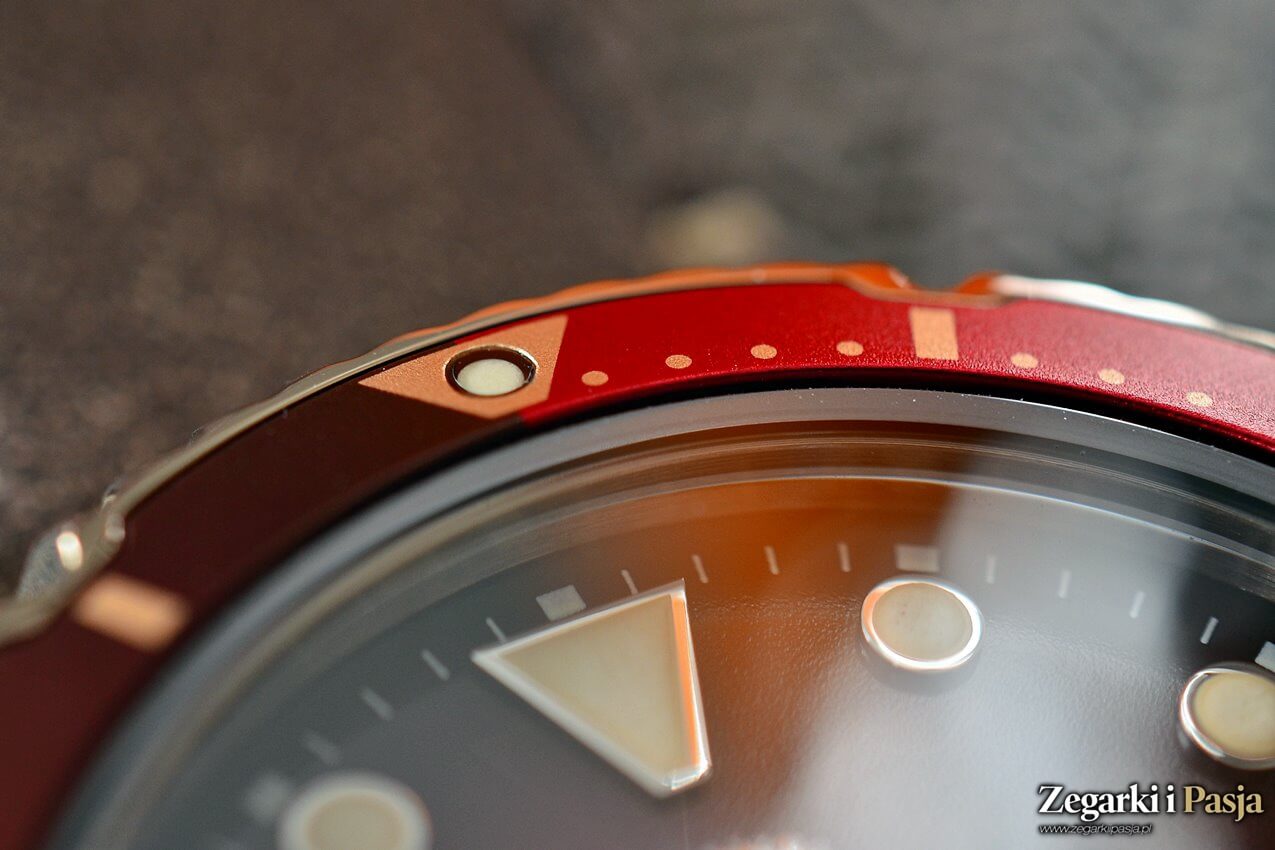 Jak już wspomniałem, koncepcja tej linii zegarków oparta jest na tym, by uzyskać efekt vintage. Taki swego rodzaju „retro look”. No i w przypadku naszego zegarka pierwszym, co rzuca się w oczy, to burgundowa tarcza z gradientowym zabarwieniem, gdzie nieco jaśniejsza jest centralna część tarczy a krawędzie przechodzą niemal w czerń. To zestawienie cyferblatu, lunety i nietypowej barwy koperty tworzy klimat zegarka, który wzmocniony jest dodatkowo kolorem masy luminescencyjnej. Jest ona w odcieniu bezowym. Po bliższym przyjrzeniu się widać, że na okrągłych indeksach krawędzie wypełnienia masą są lekko ciemniejsze. Jeśli to zamierzony efekt, a na to wygląda, mający na celu imitować starą masę świecącą, to wyszło super.