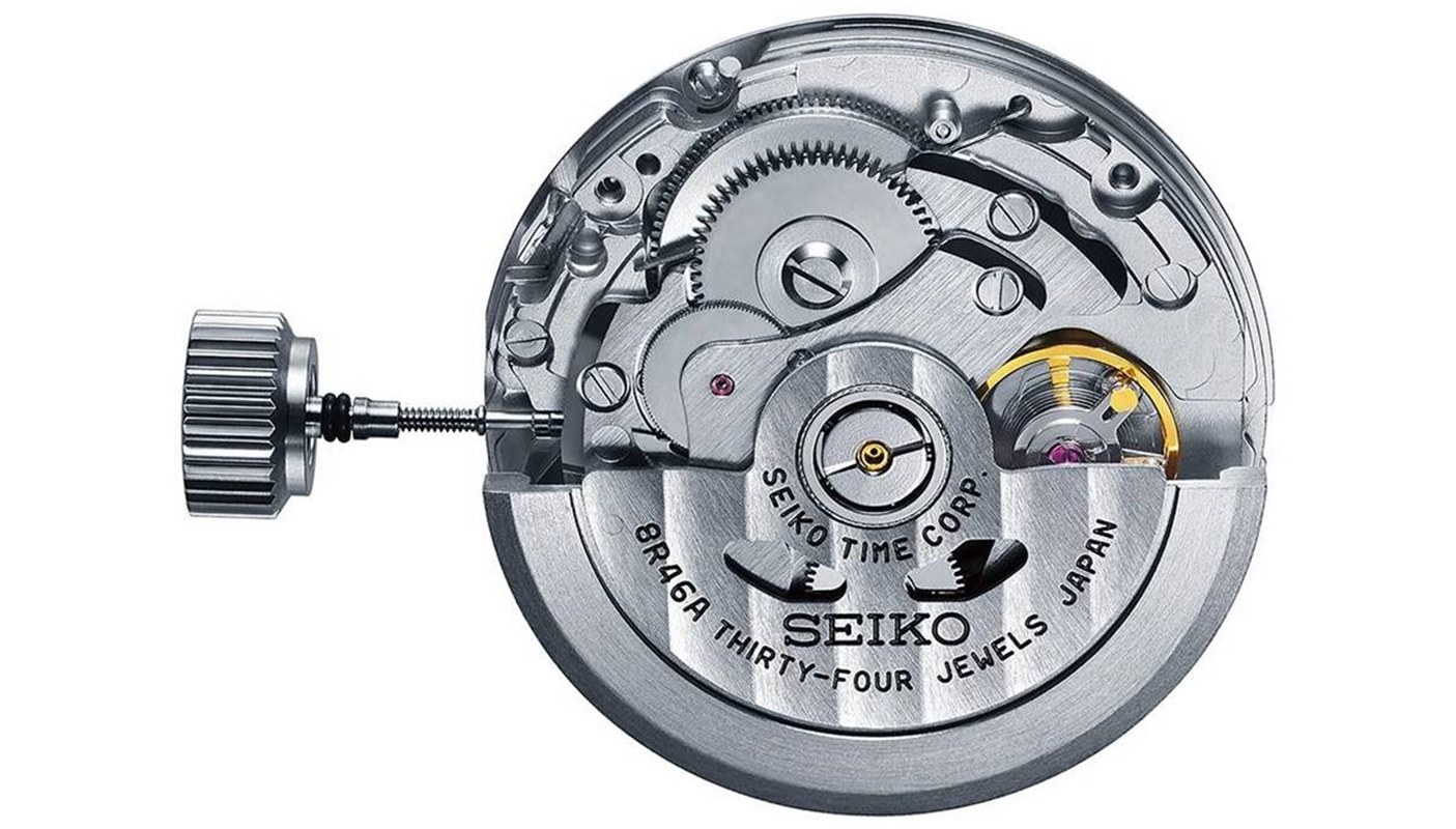 Pod nim ujrzymy mechanizm własny marki Seiko kaliber 8R46. Posiada on automatyczny naciąg sprężyny i dodatkowe komplikacje konstrukcji w postaci stopera i wskazania daty. Charakteryzuje się on obecnością koła kolumnowego i 34 kamieni łożyskujących, rezerwą chodu wynoszącą 45 godzin i częstotliwością pracy wynoszącą 28 800 wahnięć na godzinę.