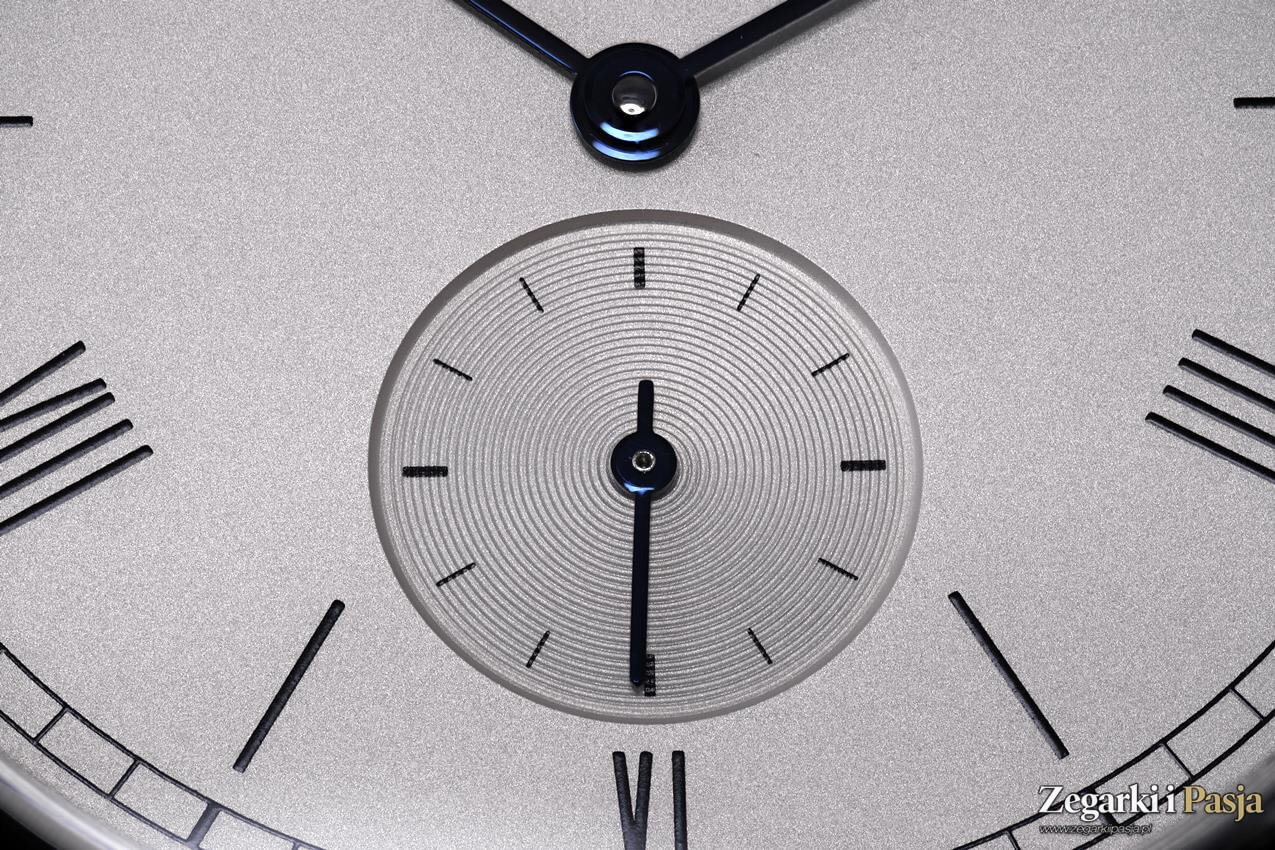 Najbardziej wysuniętym na zewnątrz elementem cyferblatu jest torowa podziałka minutowa. Delikatnie wyszczególniono na niej znaczniki znajdujące się co 5 minut. Godziny są oznaczone osobnymi indeksami, które mają dwojaką formę. Parzyste przedstawione są za pomocą cyfr rzymskich, a pozostałe w formie kresek. Rzymska szóstka została wyraźnie zmniejszona, ustępując miejsca subtarczy ze wskazaniem sekund. Jej wykończenie różni się od pozostałej części tarczy, w tym miejscu bowiem znajdziemy okalające oś małej wskazówki sekundowej żłobienia. Co 5 sekund naniesione są kreskowe indeksy, z wyróżnieniem w formie pogrubienia tych, odpowiadających za: 15, 30, 45 i 60 sekund.
