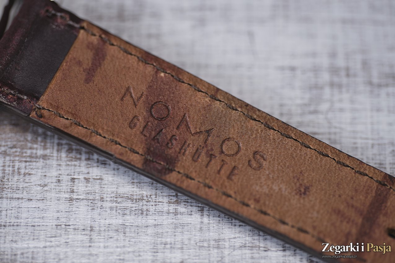 Pod indeksem na godzinie 6., poza podziałką minutową, znajdziemy napis “made in Germany”, a poniżej indeksu, na godzinie 12., logo marki w postaci napisu “Nomos Glashütte”.