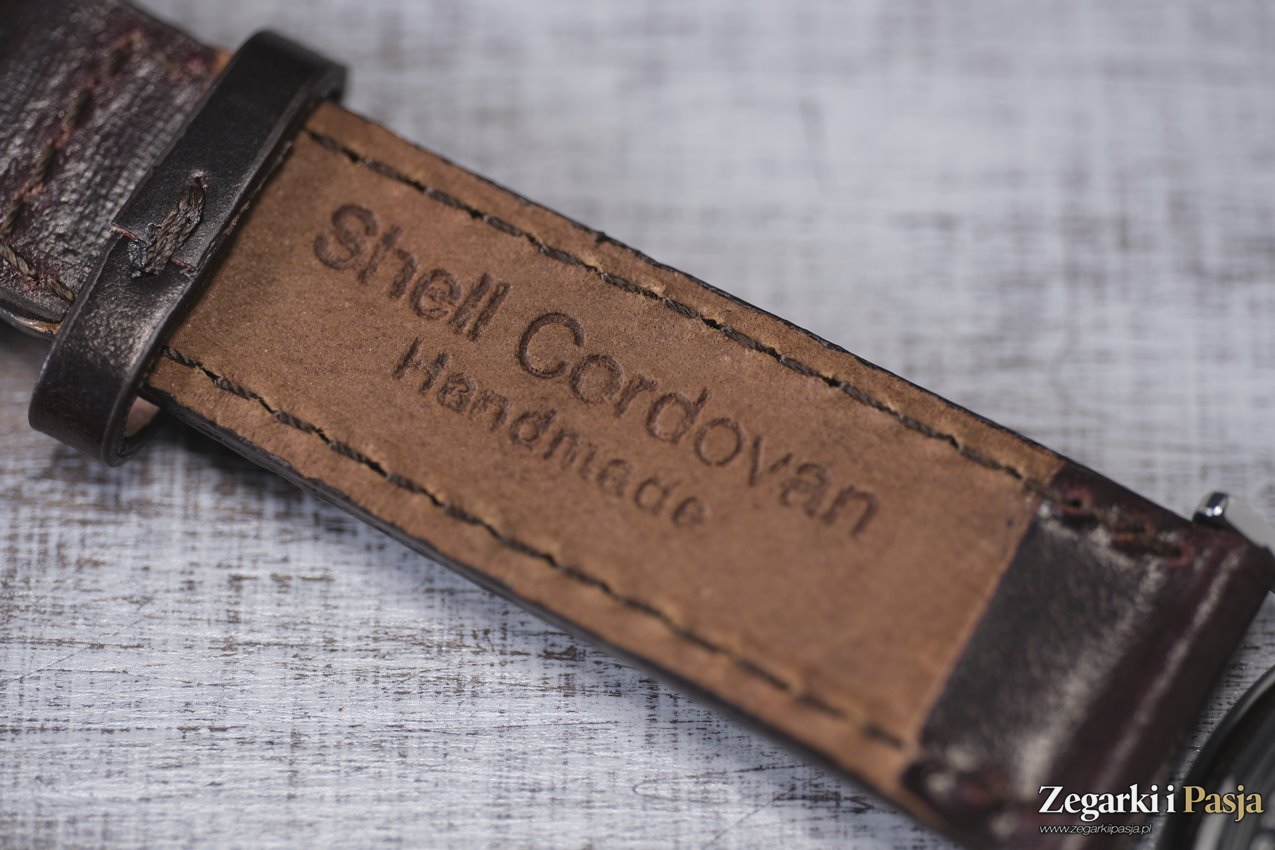Poczucia dobrego stosunku jakości do ceny dopełnia pasek, na którym zegarek otrzymujemy. Jest on wykonany ze skóry naturalnej - jej rodzaj jednak również wyróżnia się na tle konkurencji. Tutaj mamy do czynienia z cordovanem - garbowaną w specjalny sposób skórą o wyjątkowej charakterystyce wykonaną z końskiego zadu. Jest ona bardzo wytrzymała, o przyjemnej i gładkiej powierzchni.