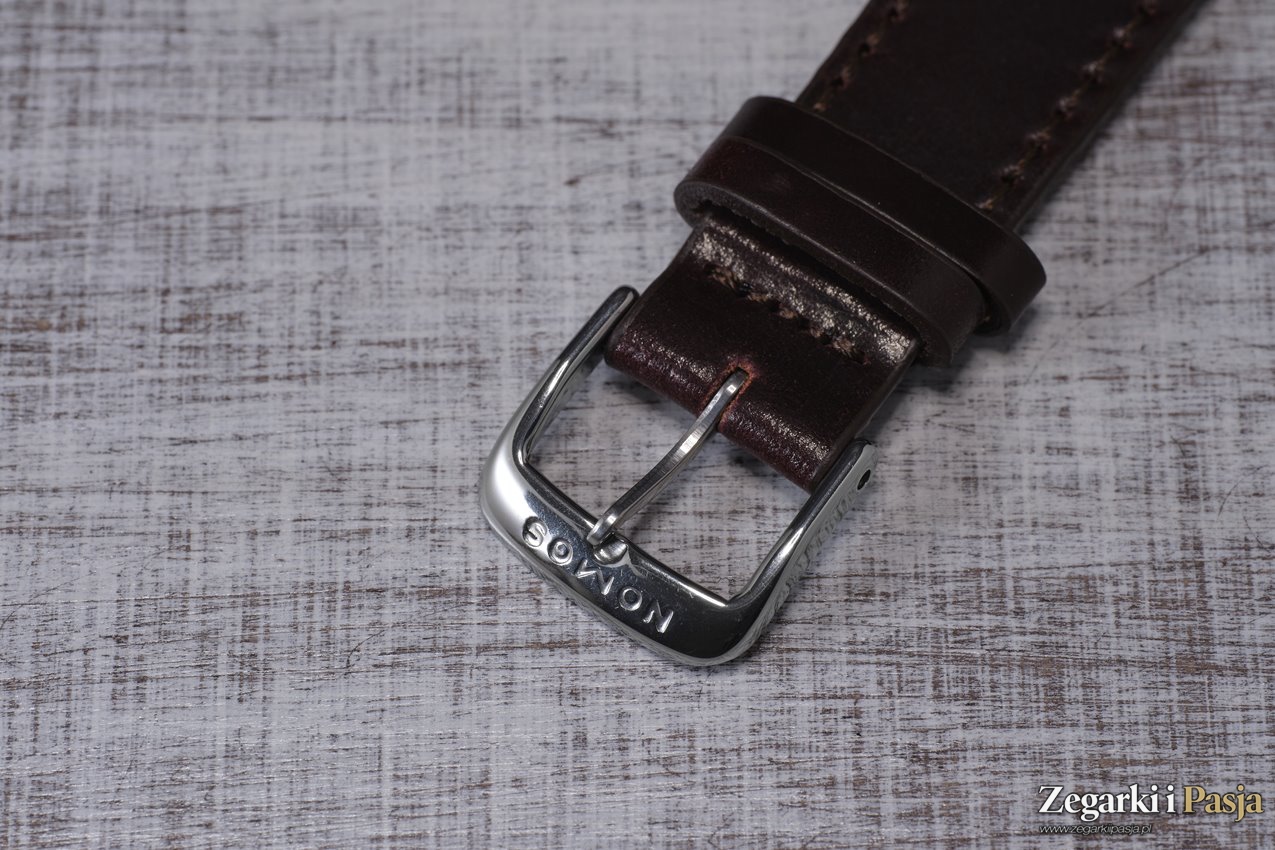 Przy odrobinie własnego wkładu w postaci niewymagającej pielęgnacji może służyć bardzo długo. W tym przypadku jest to cordovan pochodzący ze słynnej garbarni Horween, specjalizującej się w tym rodzaju skóry. Domyślnie pasek do tego modelu jest w kolorze czarnym, na życzenie może jednak zostać wymieniony na brązowy, tak jak to miało miejsce w moim przypadku. W obu wariantach jest on obszyty dookoła nicią w kolorze pasującym do barwy skóry. Zapięcie paska to klasyczna klamra o polerowanej powierzchni, z otworami ułatwiającymi demontaż. Znajdziemy na niej również wytłoczoną nazwę marki.