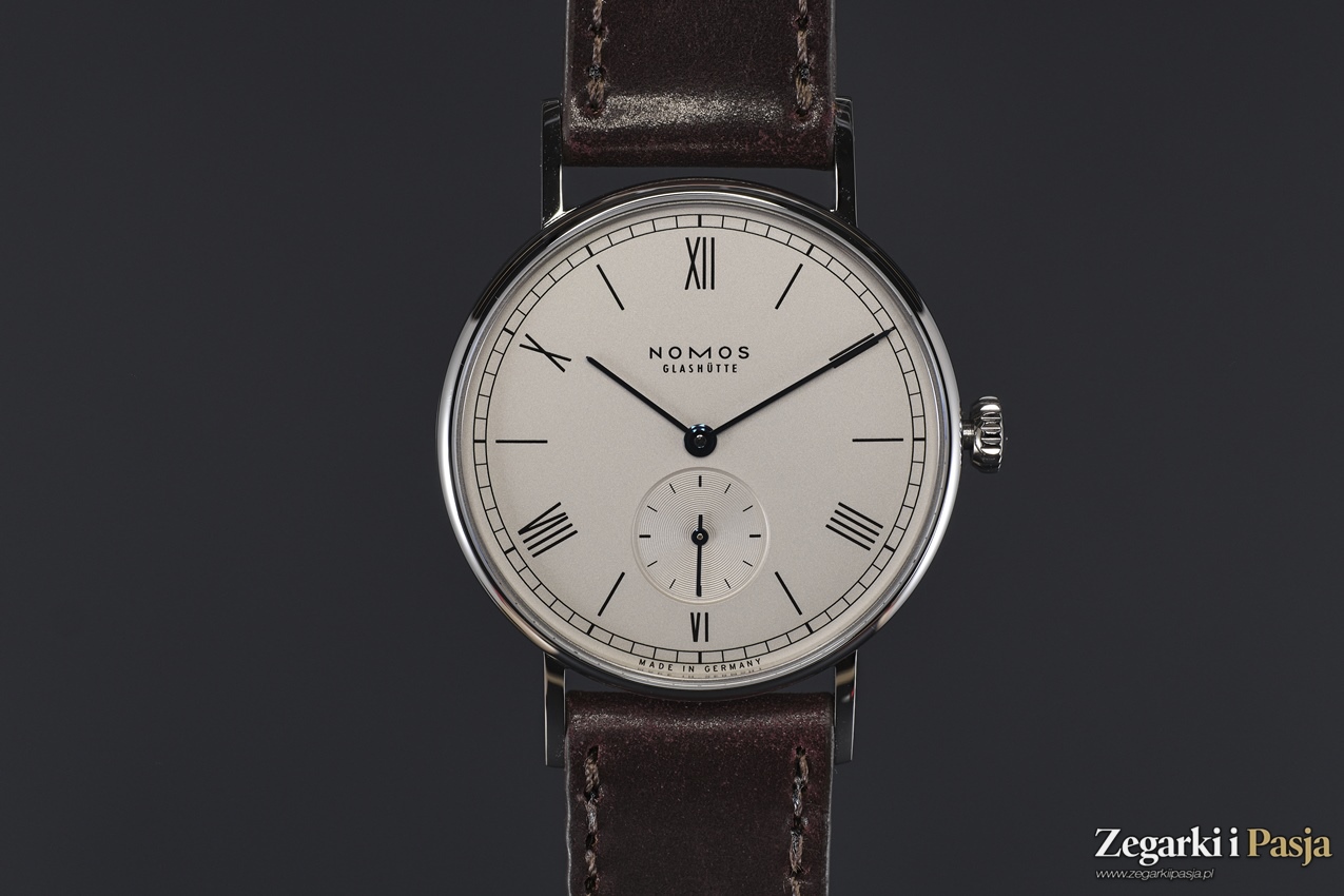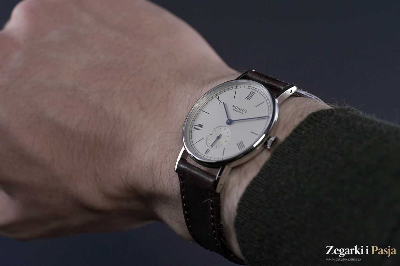Tak jak wspomniałem, średnica koperty wynosi 35 mm - jest to dosyć niewielki rozmiar patrząc na dzisiejsze standardy (a może bardziej trendy) w branży, dlatego jego obecność w ofercie marki Nomos może cieszyć miłośników zegarków lubiących stylistykę vintage, a zarazem posiadających trochę skromniejsze nadgarstki.