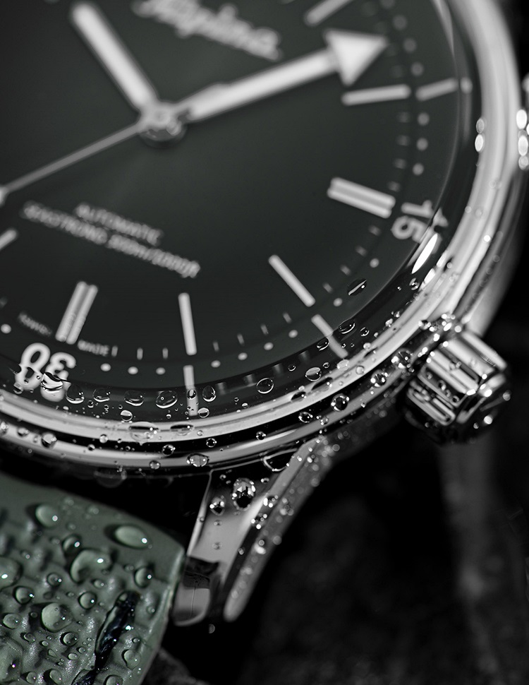 Tylko pasek jest wyraźnie zielony, choć nie w soczystym wydaniu, a raczej w postaci stonowanej, wyblakłej zieleni. Dzięki dwóm zakręcanym koronkom – jednej do ustawiania czasu, drugiej do ustawiania obrotowego, wewnętrznego pierścienia z nurkową skalą minutową, zegarek ten ma jednocześnie rasowy wygląd a z drugiej strony jednoznacznie jest kojarzony z historycznymi modelami marki Alpina.