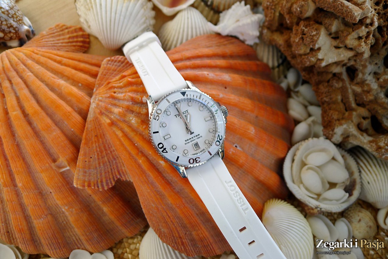 W tym roku marka Tissot wyraźnie chce podkreślić fakt, iż zegarki typu diver – z reguły kojarzone z dużymi, wytrzymałymi męskimi modelami – mogą z powodzeniem być wykonane także w mniejszej wersji z myślą o kobietach. Trzy warianty modelu Seastar 1000 Quartz mają taką samą, mierzącą 36 mm średnicy kopertę wykonaną ze stali szlachetnej. Poszczególne wersje różnią się między sobą kolorami tarcz – dostępne są tarcze w kolorze czarnym, niebieskim lub białym, a kolorystyka tarczy przekłada się na kolor obrotowego pierścienia ze skalą do nurkowania. W wersji niebieskiej i białej pierścienie mają naniesioną skalę w tych samych kolorach co tarcza, natomiast wariant z tarczą w kolorze czarnym ma okienko datownika oraz skalę na pierścieniu w kolorze żółtego złota.