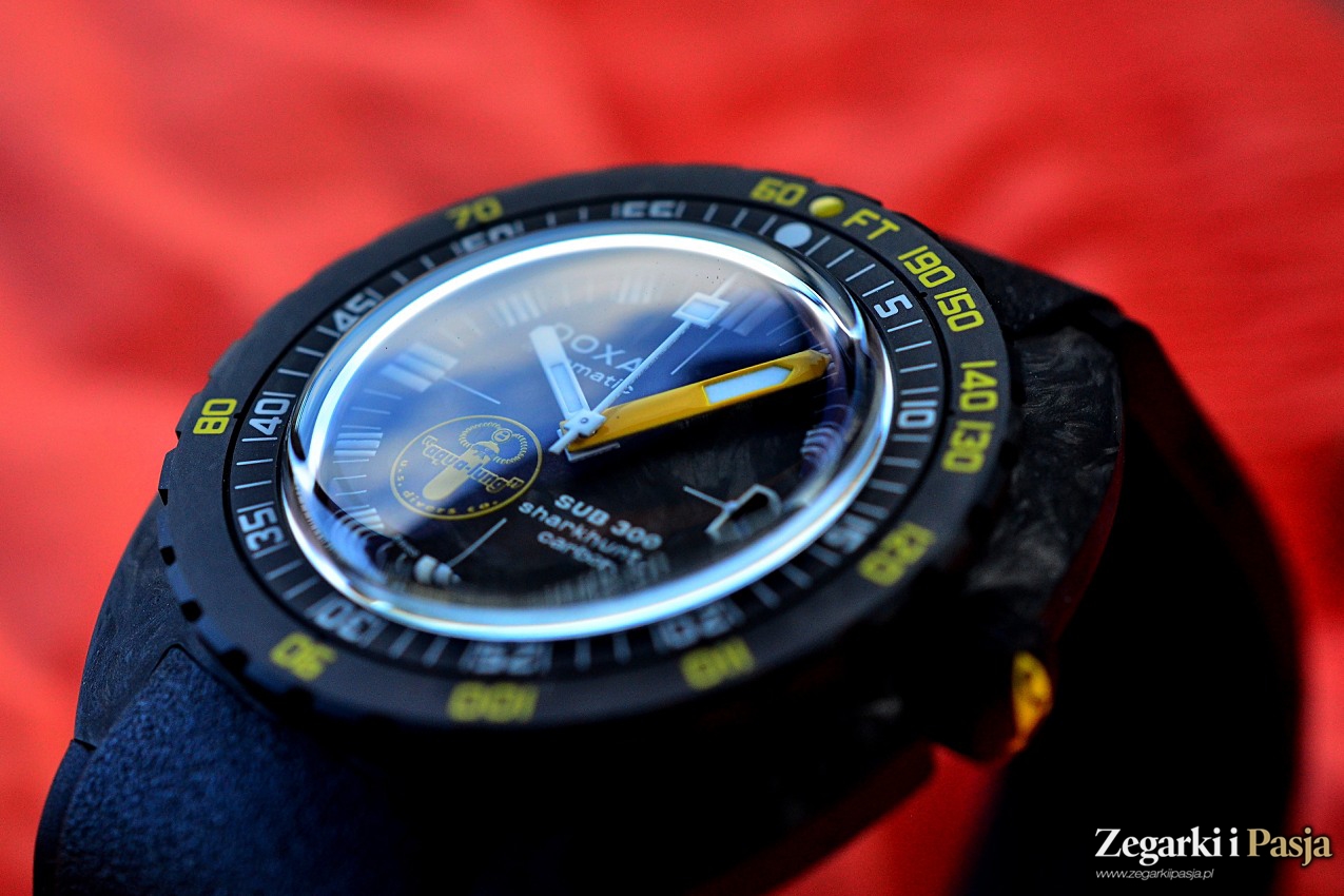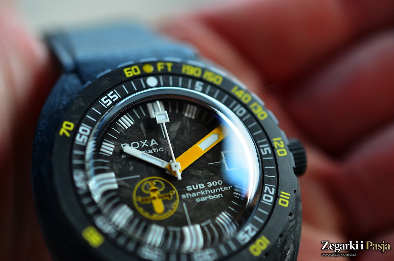 Od góry kopertę wieńczy luneta. To znana, opatentowana luneta marki Doxa. Jest ona dwuczęściowa i także wykonano ją z włókna węglowego. Wewnętrzny pierścień ma naniesioną skalę minutową a wygrawerowane oznaczenia są wypełnione białym lakierem. Oznaczenia głębokości w stopach są umieszczone na zewnętrznym pierścieniu i wypełniono je żółtym lakierem. Wszystko widać doskonale na ciemnym tle.