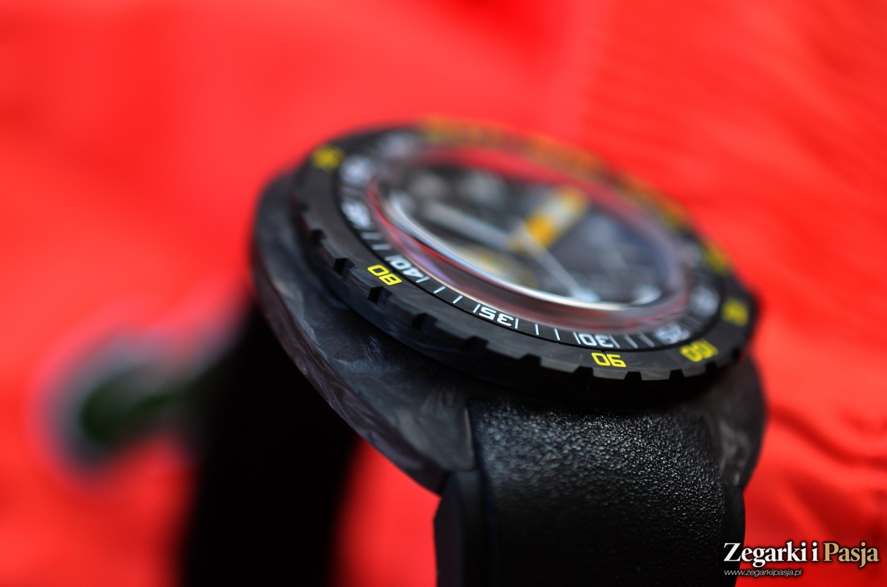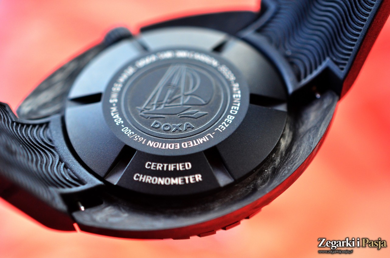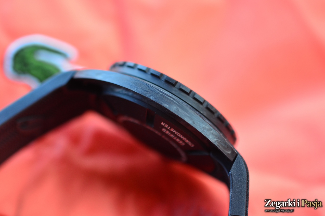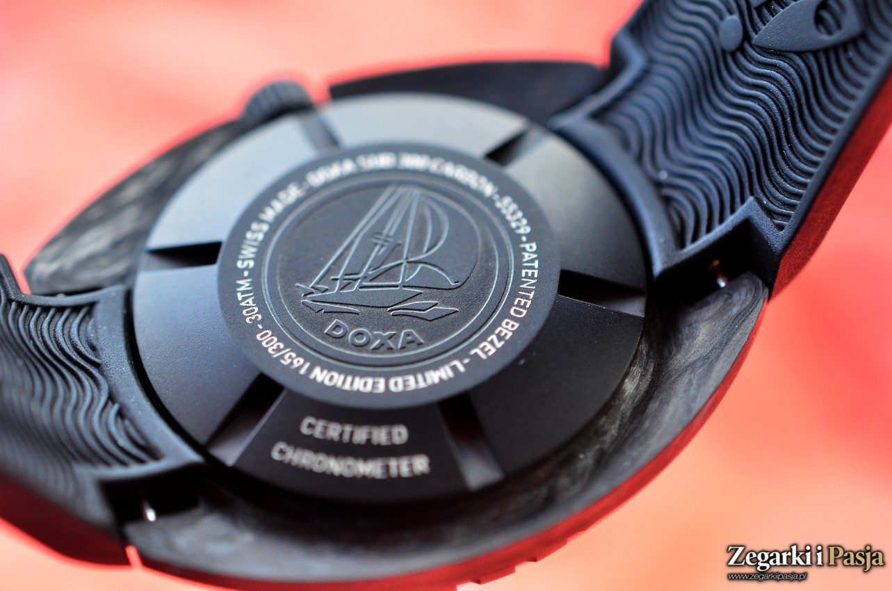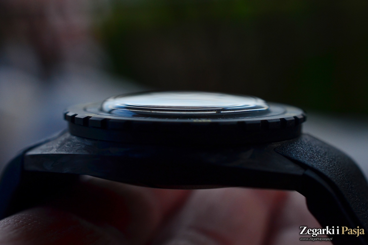 Średnica koperty wynosi 42,5 mm. Materiał z którego jest wykonana to włókno węglowe. Powierzchnie są gładkie, ale matowe. „Carbon” jest przyjemny w dotyku, ciepły. Uzyskane podczas obróbki krawędzie są wyraziste i ostre. Kilkakrotnie miałem do czynienia z zegarkami których obudowy były wykonane z tego materiału. Nigdy nie był to wprawdzie długi okres, ale też nigdy nie zdarzyło mi się po krótkim używaniu dostrzec rys, zadrapań czy innych defektów. W przypadku testowanej Doxy takie ewentualne zdarzenia skutecznie mogłyby być maskowane niejednorodną barwą i kompozycją koperty.