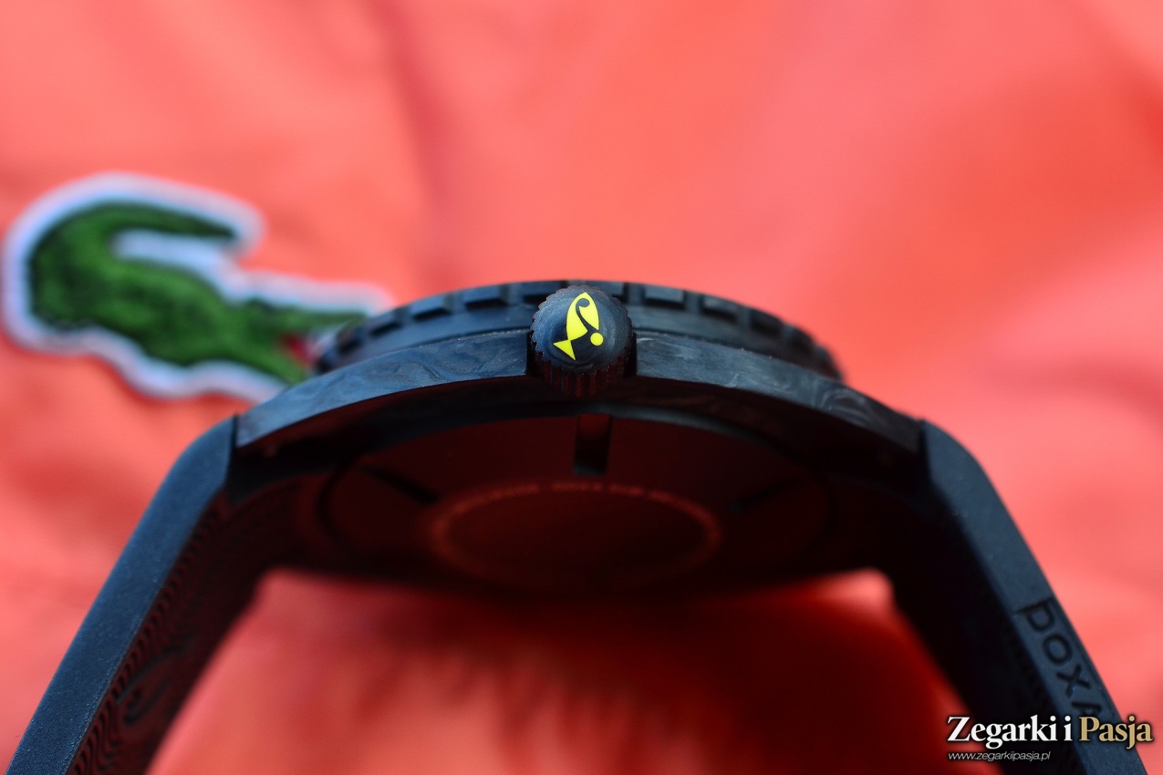 Wodoszczelność na poziomie 300 m to cecha znana i oczekiwana od modeli z serii SUB. Koronka jest zakręcana, umieszczono ją w tradycyjnym miejscu, czyli na godzinie 3. Proces operowania nią jest łatwy - bezproblemowo się odkręca i podobnie łatwo „łapie” gwint przy zakręcaniu. Nieco oporu stawiała w naszym recenzowanym egzemplarzu przy odciąganiu do poszczególnych pozycji. Koronka w zegarku nurkowym powinna być chroniona, bo pod wodą nietrudno o coś zahaczyć. Tutaj jej lekkie zagłębienie w boku koperty stanowi zabezpieczenie. Czołową część czarnej koronki zdobi jaskrawo żółty detal w postaci wizerunku ryby Doxy.
