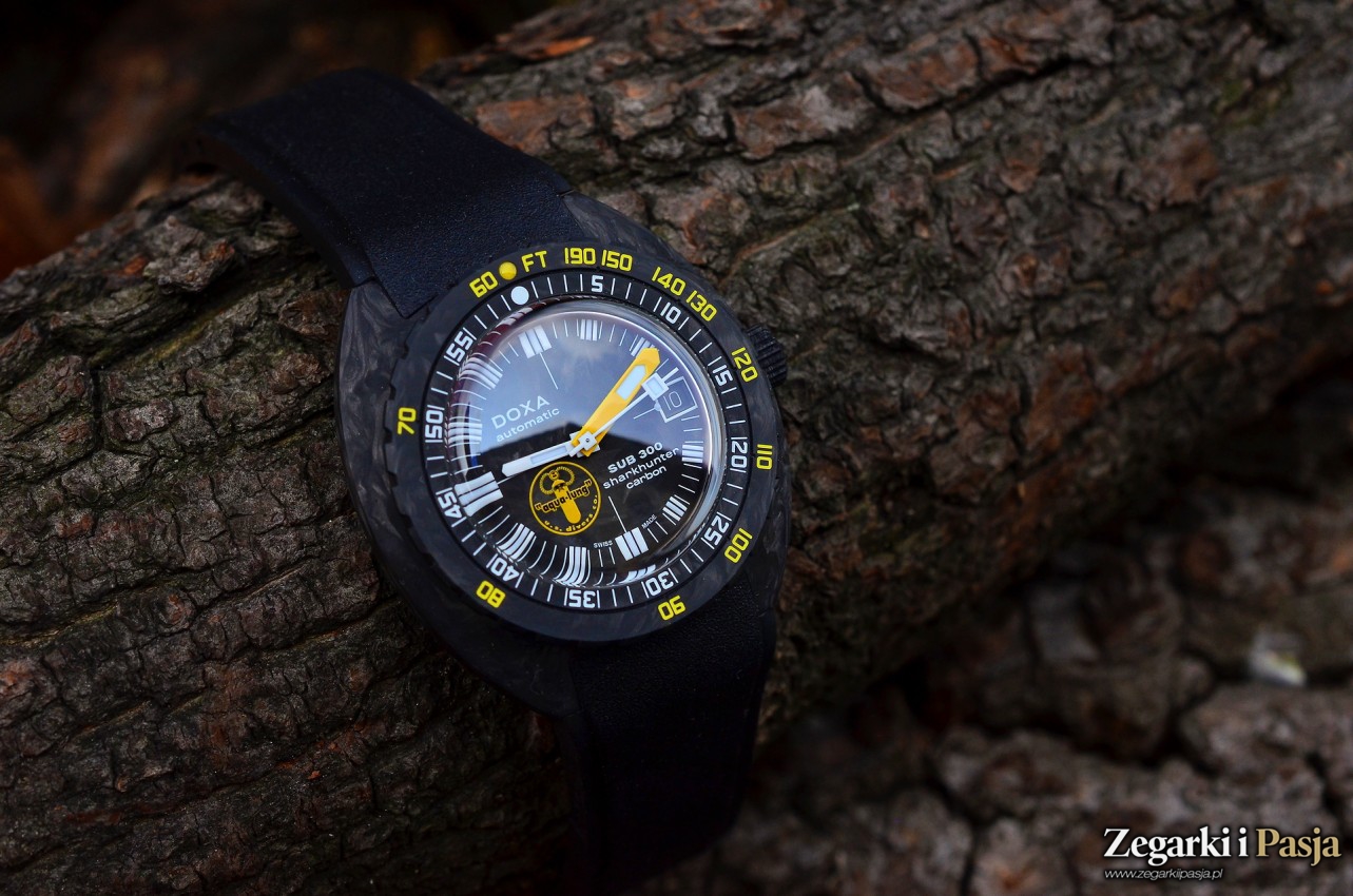 Doxa SUB 300 Sharkhunter Carbon Aqua Lung Limited Edition jest bardzo lekkim zegarkiem, szczególnie w porównaniu do modeli wykonanych ze stali nierdzewnej. To oczywiście zasługa materiału użytego to wykonania koperty, a to jedna z zalet o których obiecałem wspomnieć. Włókno węglowe charakteryzuje się dużą wytrzymałością, przy naprawdę niewielkiej wadze. Wrażenie lekkości odczuwalne po założeniu zegarka na nadgarstek potwierdza pomiar jego wagi – wynosi ona jedynie 87 gramów. Poza lekkością, kolejną pozytywną cechą jest niepowtarzalność ze względu na formujące się wzory na powierzchni tego typu koperty. Każdy zegarek z limitowanej do 300 egzemplarzy serii ma te wzory na kopercie inne. Odcienie układają się inaczej - od kruczoczarnych po szare, nieregularnie ułożone, stapiające się ze sobą linie przeplatają się tworząc opalizującą i grającą refleksami kompozycję, której wygląd zmienia się wraz z intensywnością i kątem padania światła otoczenia. Ten bardzo niejednorodny wzór, uzyskany dzięki pracy z losowo zorientowanymi włóknami węglowymi, tworzy subtelną równowagę składającą się na atrakcyjną i zarazem wytrzymałą kopertę, oczekiwaną od profesjonalnego zegarka nurkowego, dodatkowo owianego legendą.
