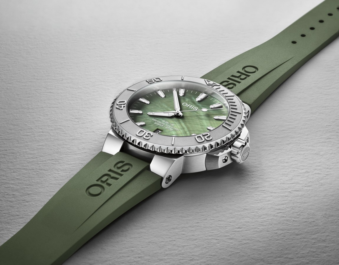 Aby wesprzeć pionierską pracę zespołu Billion Oyster Project powstała limitowana edycja Oris Aquis New York Harbor Limited Edition. Wykonano tylko 2000 egzemplarzy specjalnego zegarka. Jego charakterystyczną cechą jest, jak wspomniałem na wstępie, zielona tarcza z masy perłowej, inspirowana kolorem wody portowej i wnętrzem muszli ostryg.
