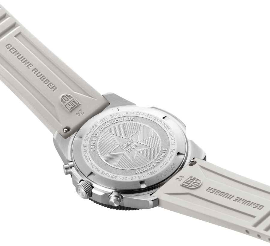 Centralny sekundnik chronografu ma solidną przeciwwagę, i w każdej z wielu wersji kolorystycznych elementów zegarka i tarczy Pacific Diver Chronograph Series 3140 ma polakierowane na czerwono zakończenie. Pod godziną 12. nadrukowano logo marki Luminox, a na godzinie 4. umieszczono okienko datownika ze wskazaniem dni miesiąca.