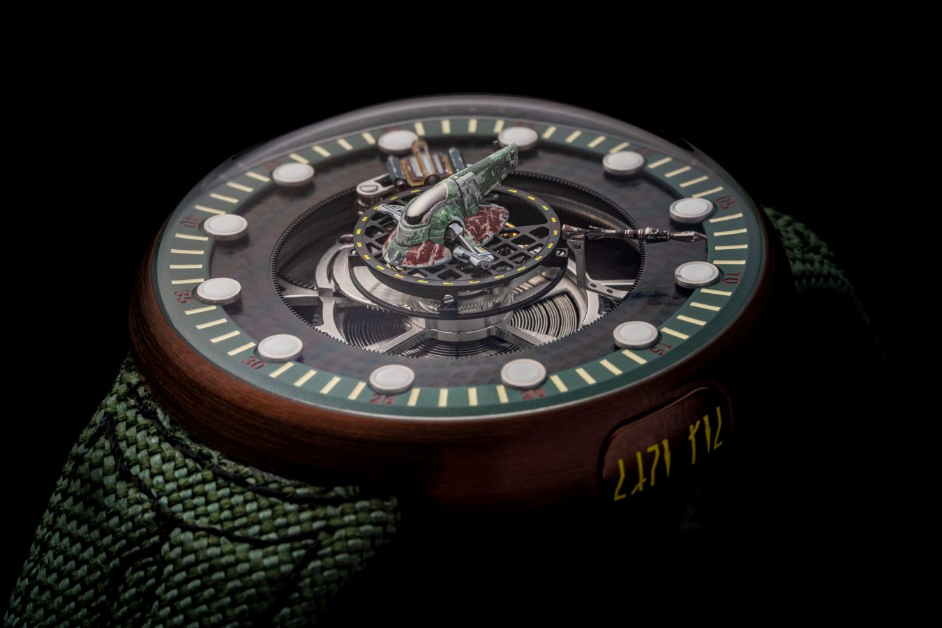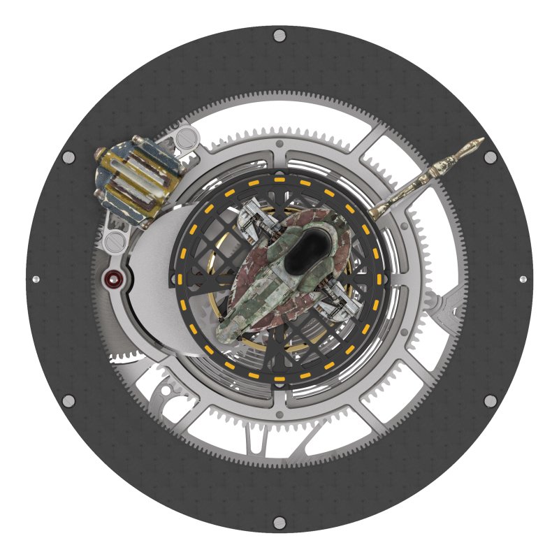 Motyw kosmicznego statku Boby Fetta pojawia się nie tylko pod postacią pudełka - znajdziemy go również na tarczy zegarka. Podobnie jak sygnalizator człowieka-nietoperza z The Batman Collector Set, tak i lądowisko razem z powietrznym okrętem pełnią funkcję klatki tourbillonu.
