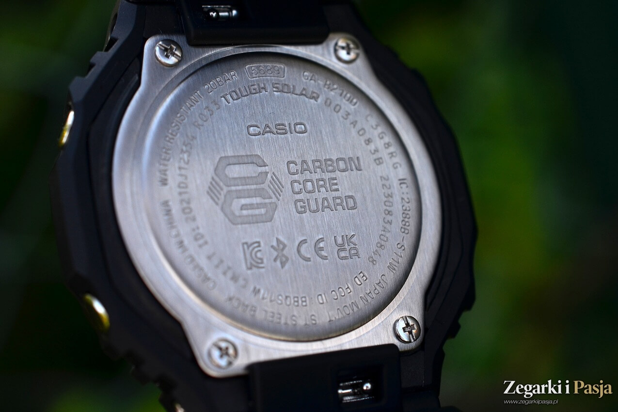 Gdy odwrócimy zegarek widzimy wytłaczany i szczotkowany dekiel przykręcany do koperty za pomocą czterech śrubek. Wygrawerowano na nim wiele informacji o tym modelu, a centralnie tę, którą uznano, że warto się pochwalić szczególnie, czyli o wzmocnionym włóknem węglowym rdzeniu obudowy. Wizerunek tego „G” ma odzwierciedlić tzw. retro look, co w zegarku tak ultra sportowym nie jest łatwe, ale chyba w jakiejś mierze się udało.