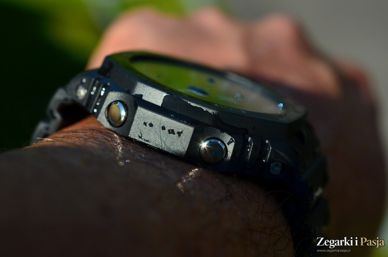 Całość otacza jakby nakładka, która jest tym elementem, który nadaje wygląd. To czarne tworzywo sztuczne, jakie miłośnicy marki doskonale znają. Czarne w zegarku, który trafił do nas, ale jest jeszcze wersja czarna bez żadnych akcentów, zielona, niebieska i żółta.