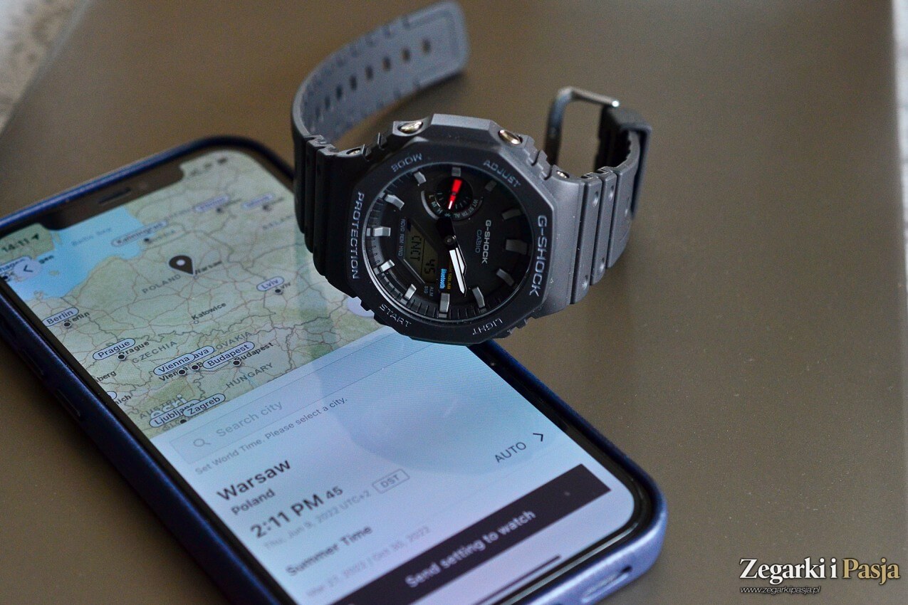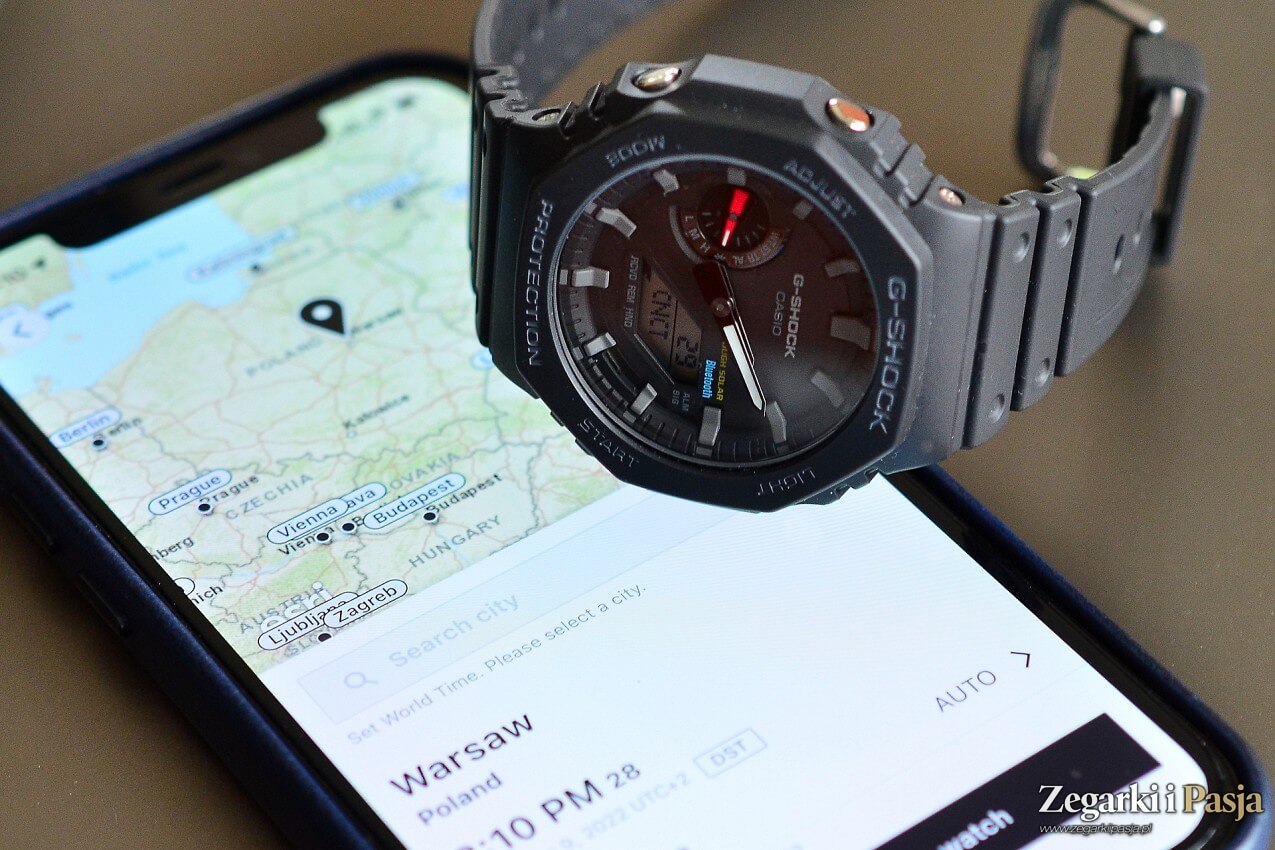 Zegarek ten nie jest smartwatchem i połączenie z telefonem, bo do tego ma służyć ten system komunikacji, ma inny cel. Jest nim głównie kalibracja czasu, oraz dostęp do ustawień zegarka w wygodny sposób z poziomu smartfona. Telefon ma czas stale korygowany dzięki połączeniu z siecią, a zegarek dzięki temu pokazuje po synchronizacji czas niemal tak dokładnie jak model z radiową korektą czasu polegającą na synchronizacji z zegarami atomowymi. Zastosowanie funkcji Bluetooth w modelu G-SHOCK GA-B2100 może rodzić obawy związane z gospodarowaniem energią, ale spokojnie, zastosowano bardzo energooszczędny system, który istotnie nie wpłynie na zużycie energii zgromadzonej w akumulatorze.