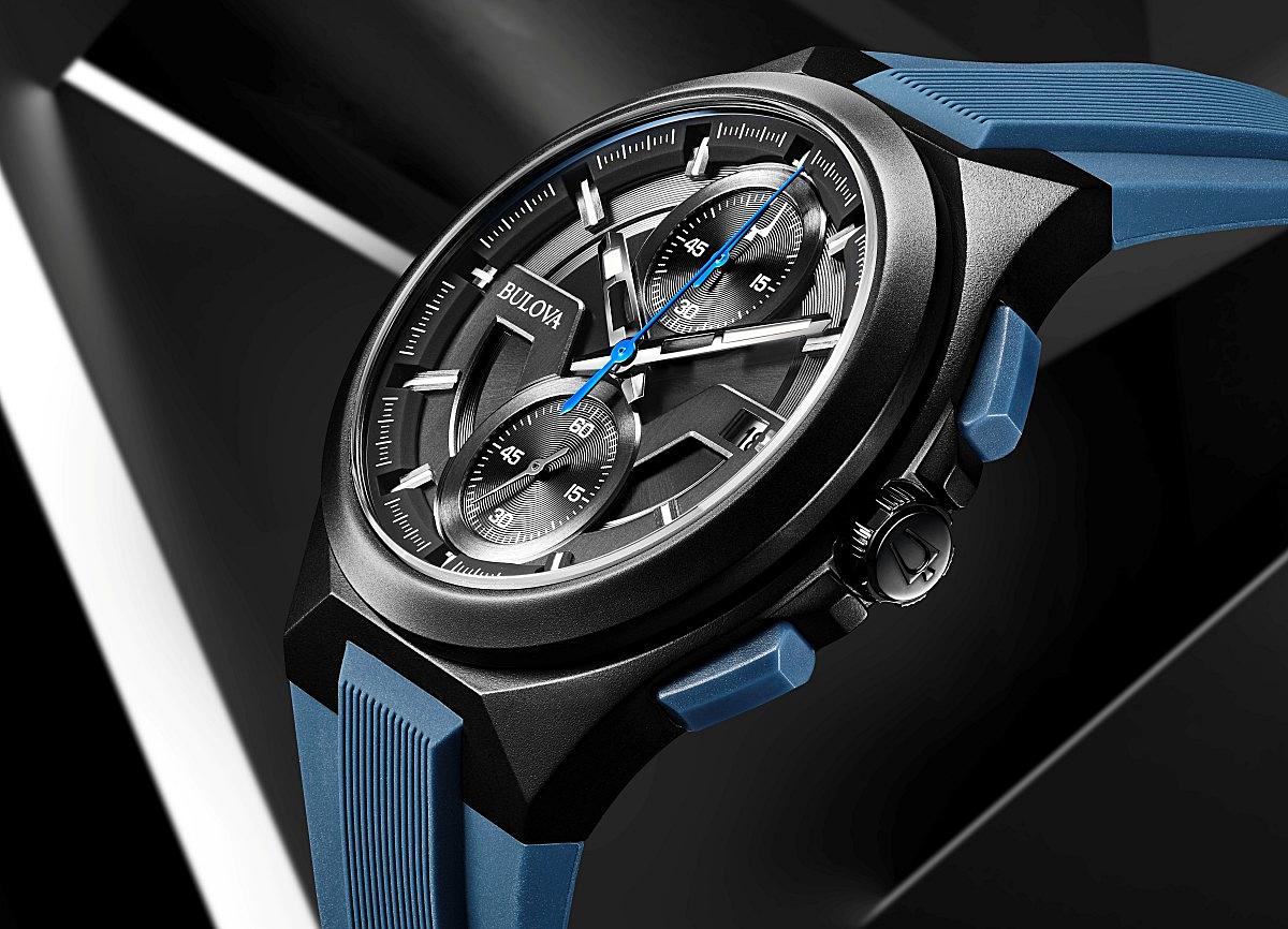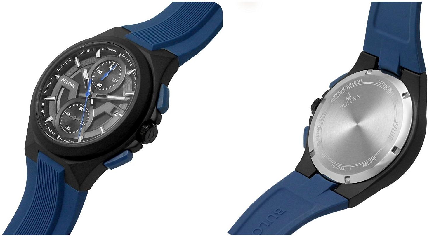 Bulova Maquina to wedle producenta odważnie zaprojektowany, sportowy zegarek inspirowany motoryzacją, który wyróżni się na każdym nadgarstku. Faktycznie, czasomierz ten ma bardzo nowoczesny wygląd, z wyrazistymi krawędziami koperty wykonanej ze stali nierdzewnej, która dzięki powlekaniu metodą jonową ma kolor czarny. Ciekawą kopertę połączono z tarczą w kolorze czarnym, a zegarek dostępny jest w dwóch wersjach - z zielonymi lub niebieskimi przyciskami. Tarcza umożliwia oczywiście odczyt czasu podstawowego, ale także funkcji dodatkowej, czyli wskazania stopera. Jest także datownik z dniami miesiąca.