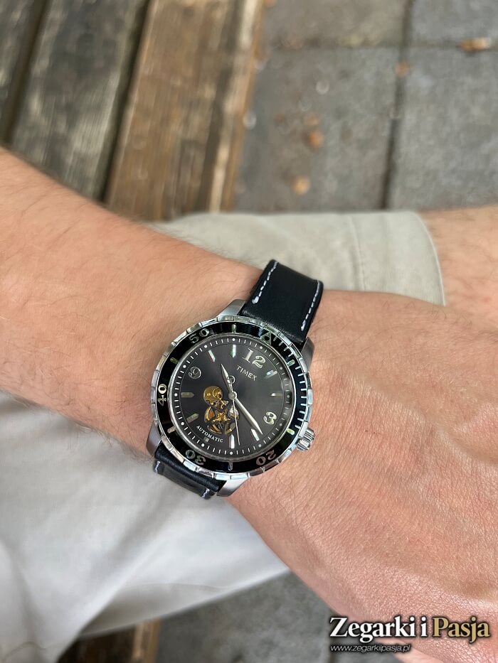 Koperta o średnicy 43 mm to w mojej opinii także bardzo uniwersalny rozmiar. Wieńczy ją czarna, polerowana luneta z naniesioną podziałką minutową, lecz niestety nie spełnia ona swojej roli ze względu na to, że nie jest obrotowa. W tym modelu Timexa zastosowano szkło mineralne, które chroni ciemną tarczę. Cyferblat ma proste, nakładane indeksy w kolorze srebrnym, które według mnie prezentują się naprawdę pięknie, oraz podkreślają głębię czarnego koloru tarczy. Na cyferblacie widoczny jest napis “Automatic”, określający rodzaj mechanizmu z jakim mamy do czynienia. Osoby, które są nieco bliżej zaznajomione z zegarmistrzostwem, nawet nie widząc tej informacji a jedynie patrząc na zegarek na żywo, z pewnością od razu rozpoznają jaki mechanizm zastosowano - “płynący” ruch wskazówki sekundnika zdradza, że mamy do czynienia z zegarkiem mechanicznym.